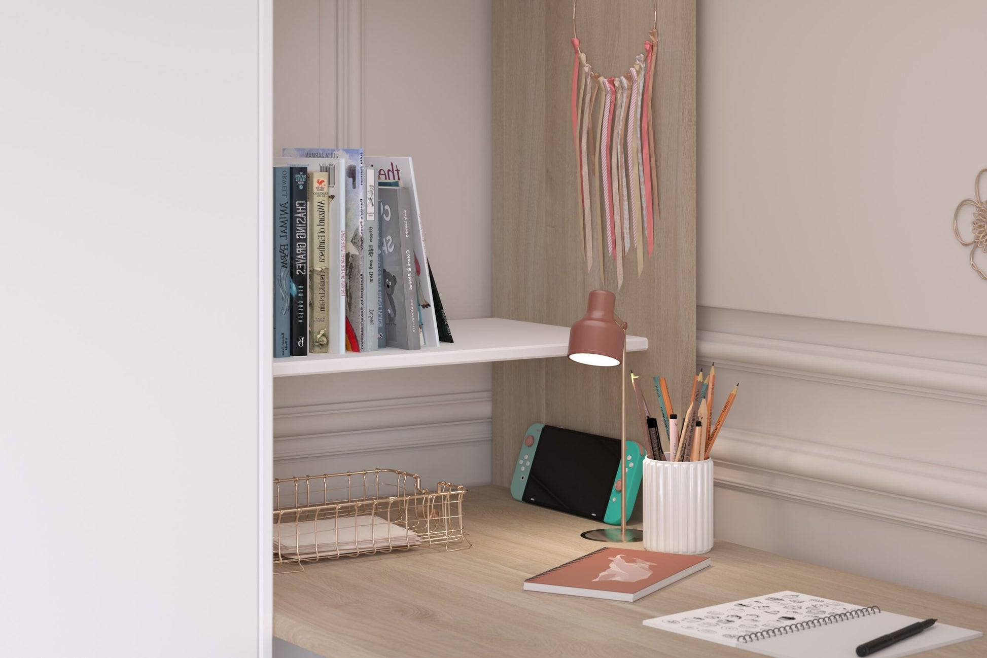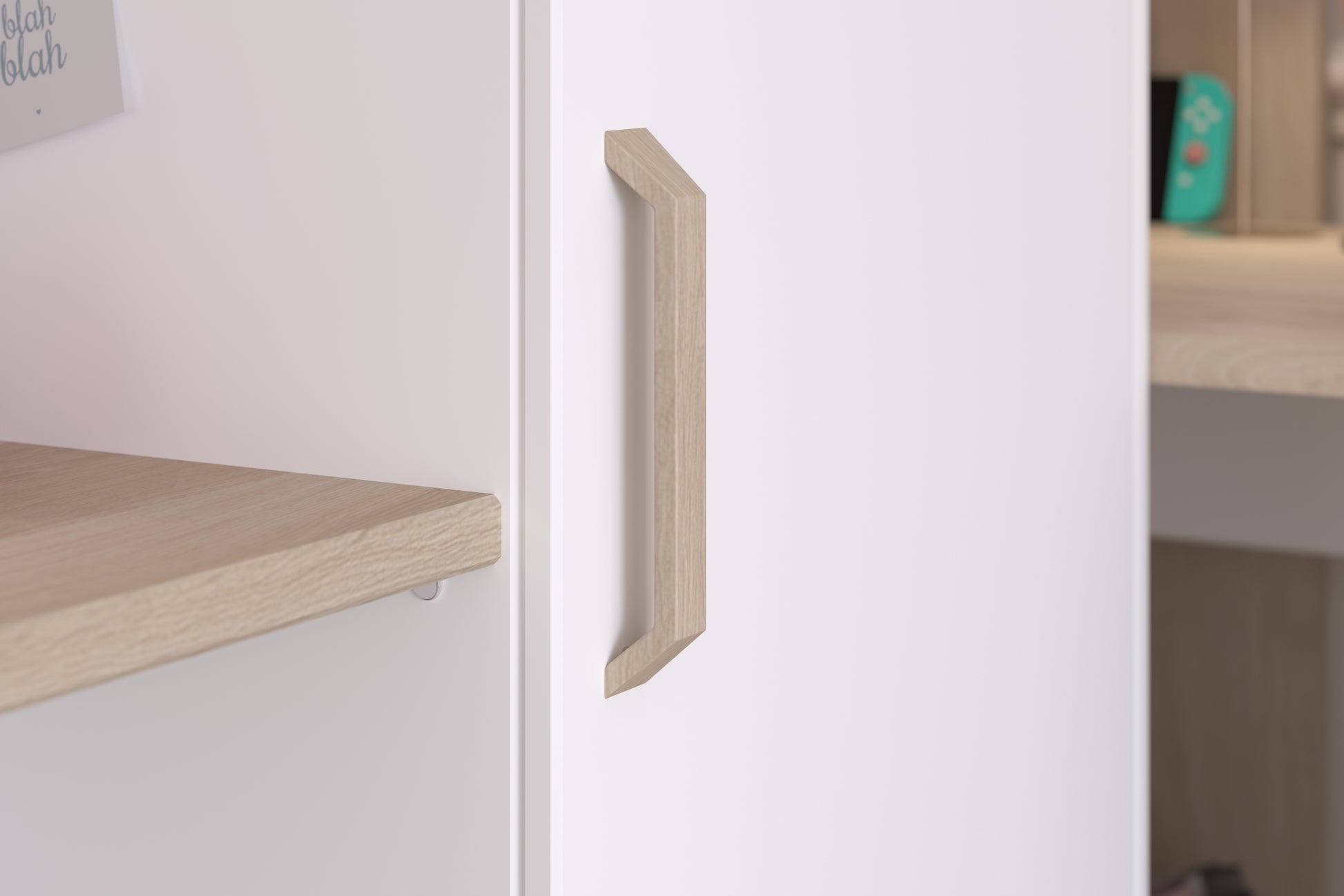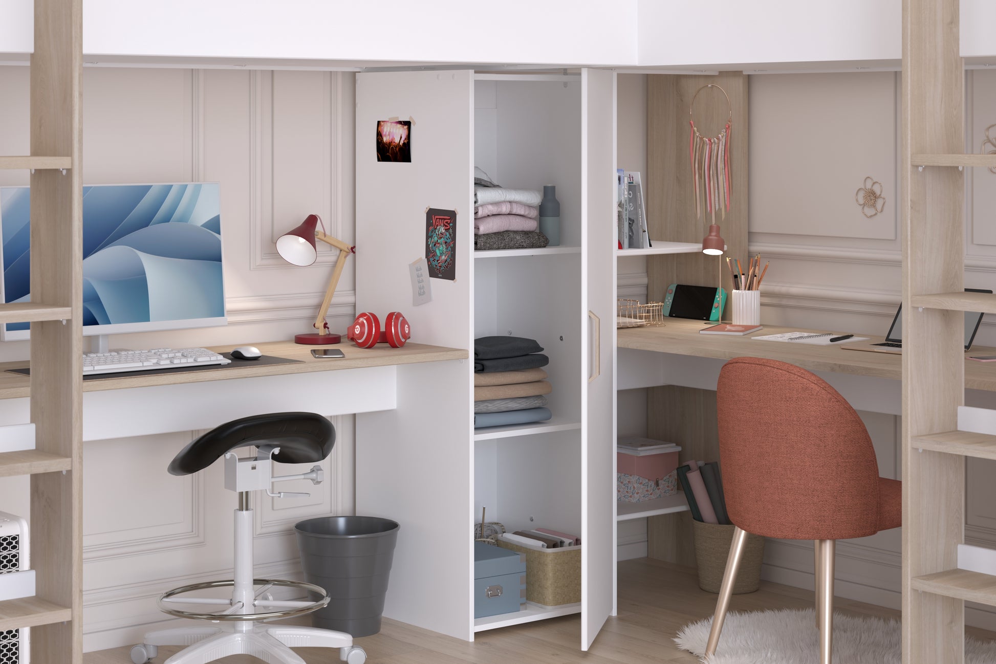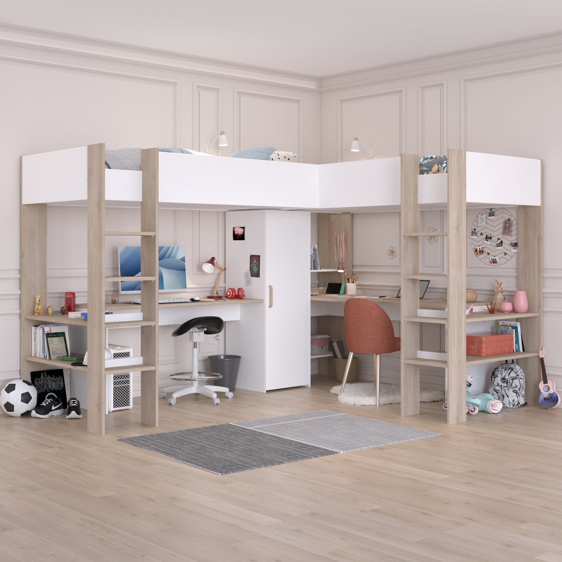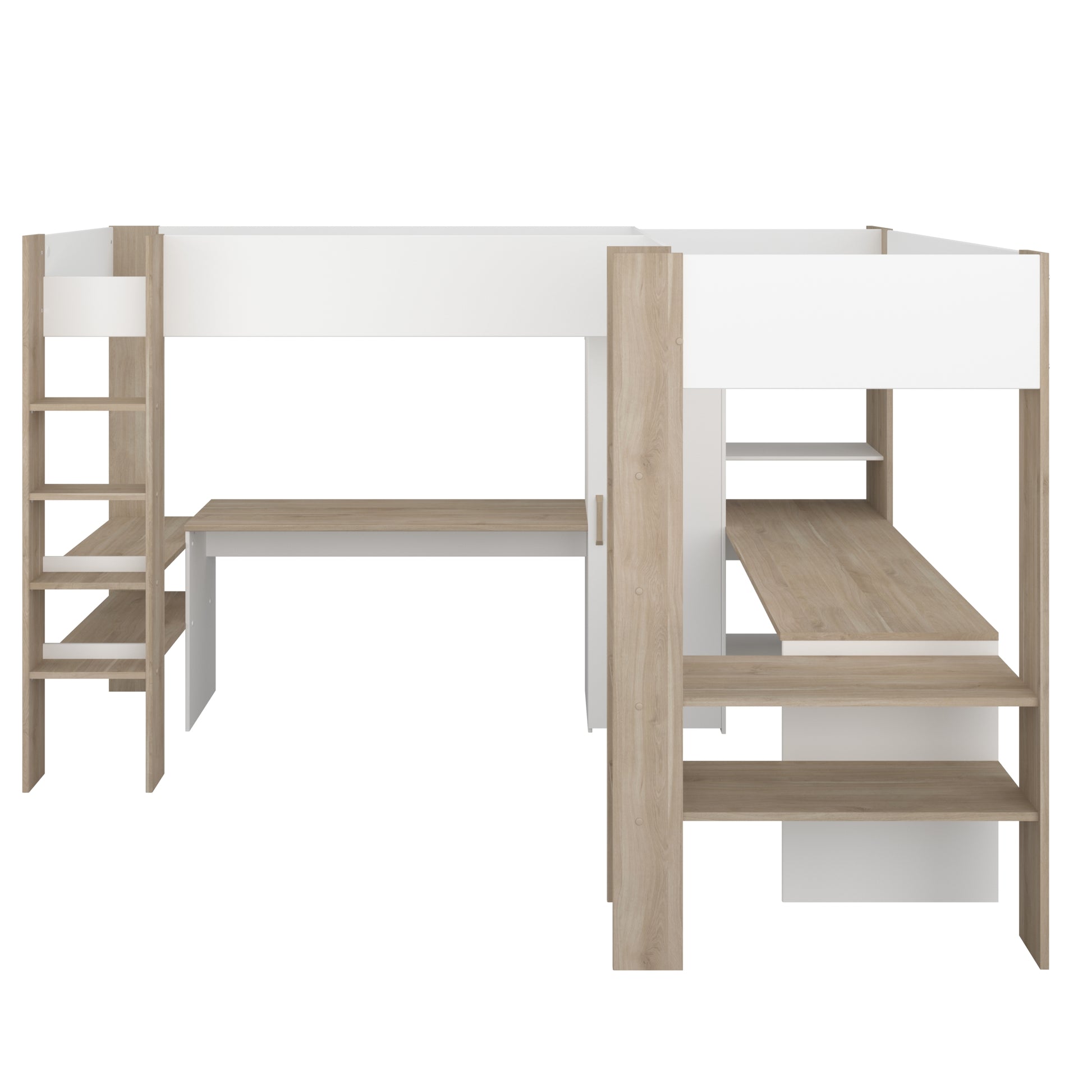 Parisot Alexandra L Shaped High Sleeper in White & Oak ideal for shard rooms, and solid constructed bed with wider ladders for safety. requires 2 EU sized single mattresses (90cm x 200cm)
