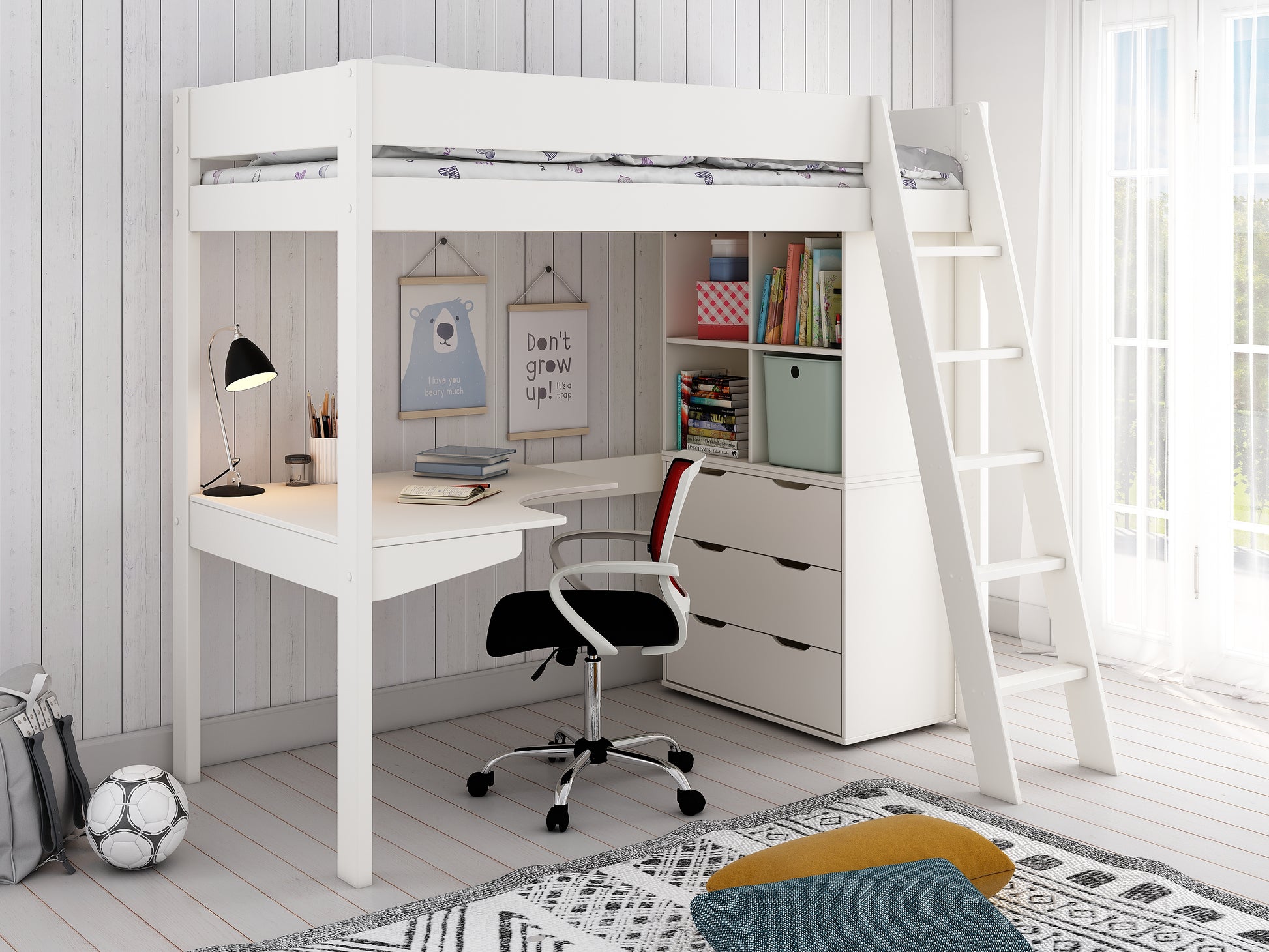 Part of the Estella collection. Finished in white the bed includes convenient storage areas with a chest of drawers & storage cube. Ideal for saving space in compact or shared spaces. Constructed strongly with a superior painted white finish on the wood. Convenient corner desk for study or play. Depending on the layout of your room, the ladder can be put together on either the left or the right side.