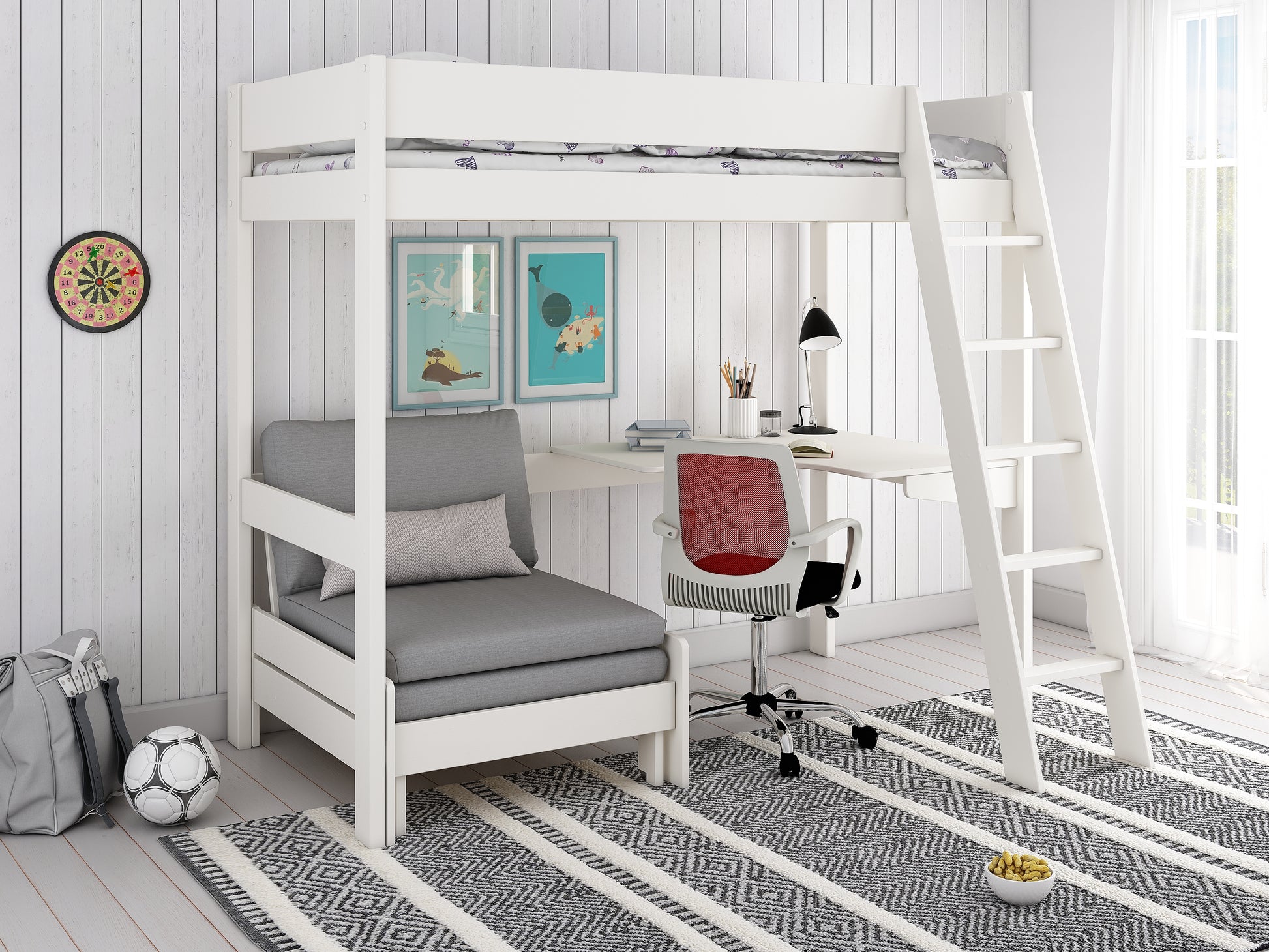 Kids Avenue Estella High Sleeper bed with Desk & Grey Sofabed, enjoy the perfect blend of style and functionality with this beds integrated desk and sofabed. Its built in desk provides the perfect place for studying and learning whilst the extendable sofabed provides ample room for an extra sleeper without compromising too much floor space.