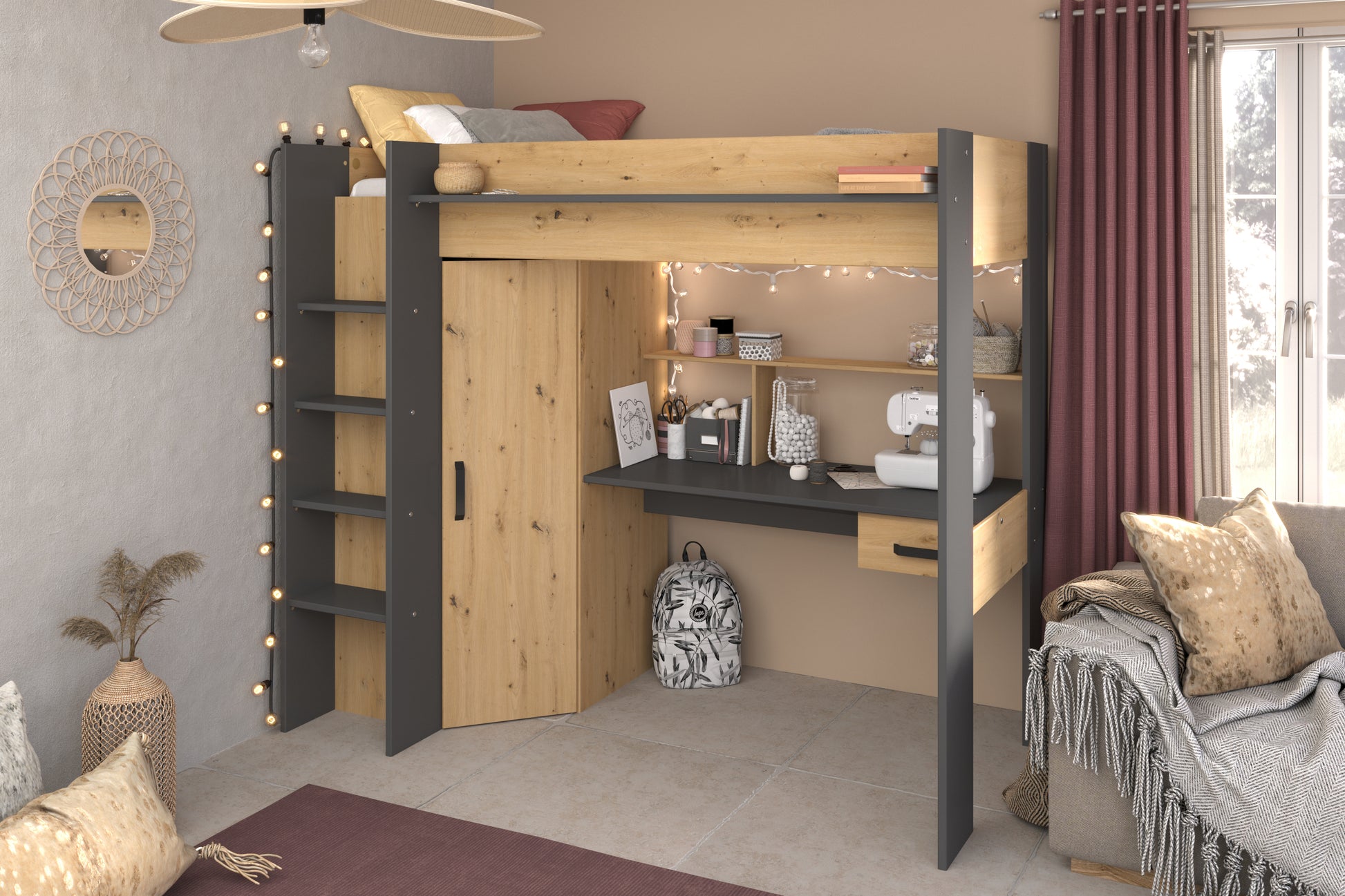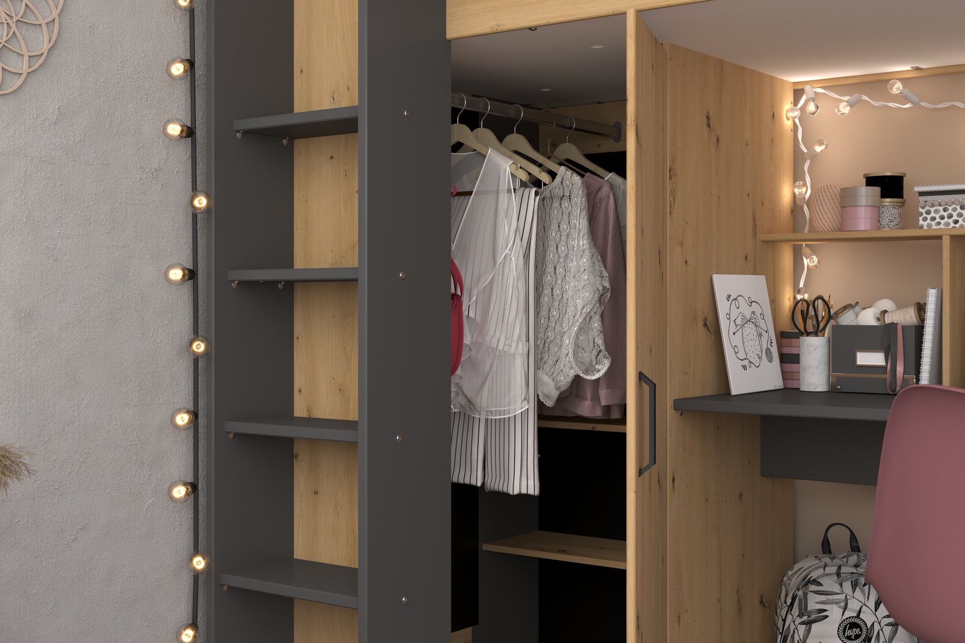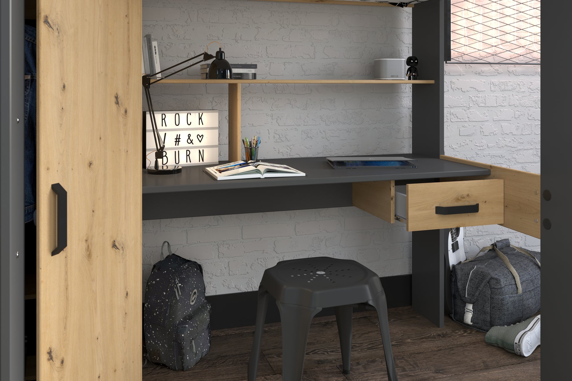 The Parisot Grayson Highsleeper is an ideal place for study or Gaming. With storage shelving and a built in desk under the bed it will create the perfect environment for bedroom space saving and work or play. The ladder on the left hand side of the bed provides easy access to the sleeping area. Wardrobe storage behind the ladder is both discrete and practical complete with hanging rail and is situated at the back left of the bed. A drawer included is convenient for pens and essentials perfect for teenagers or students.