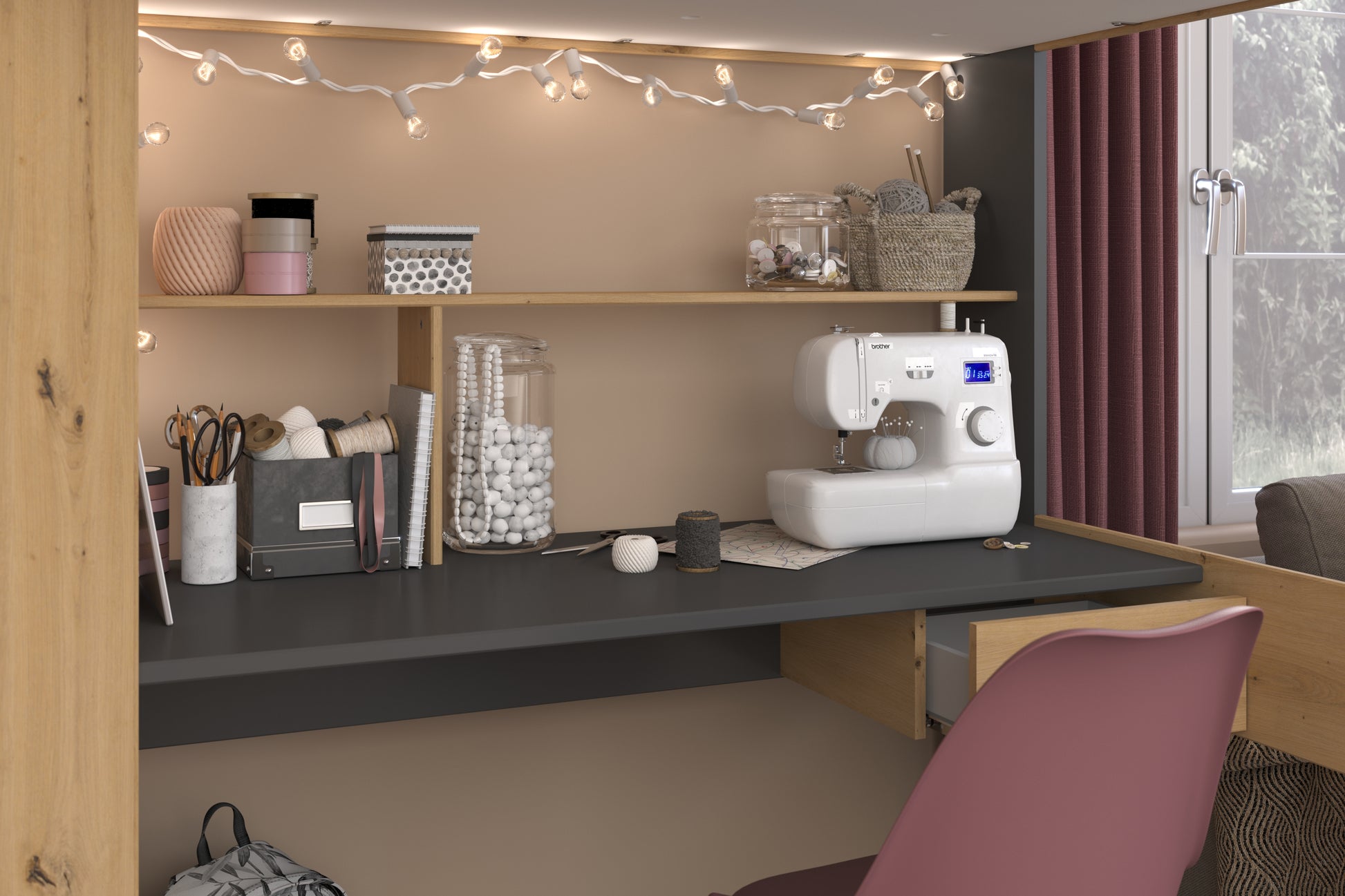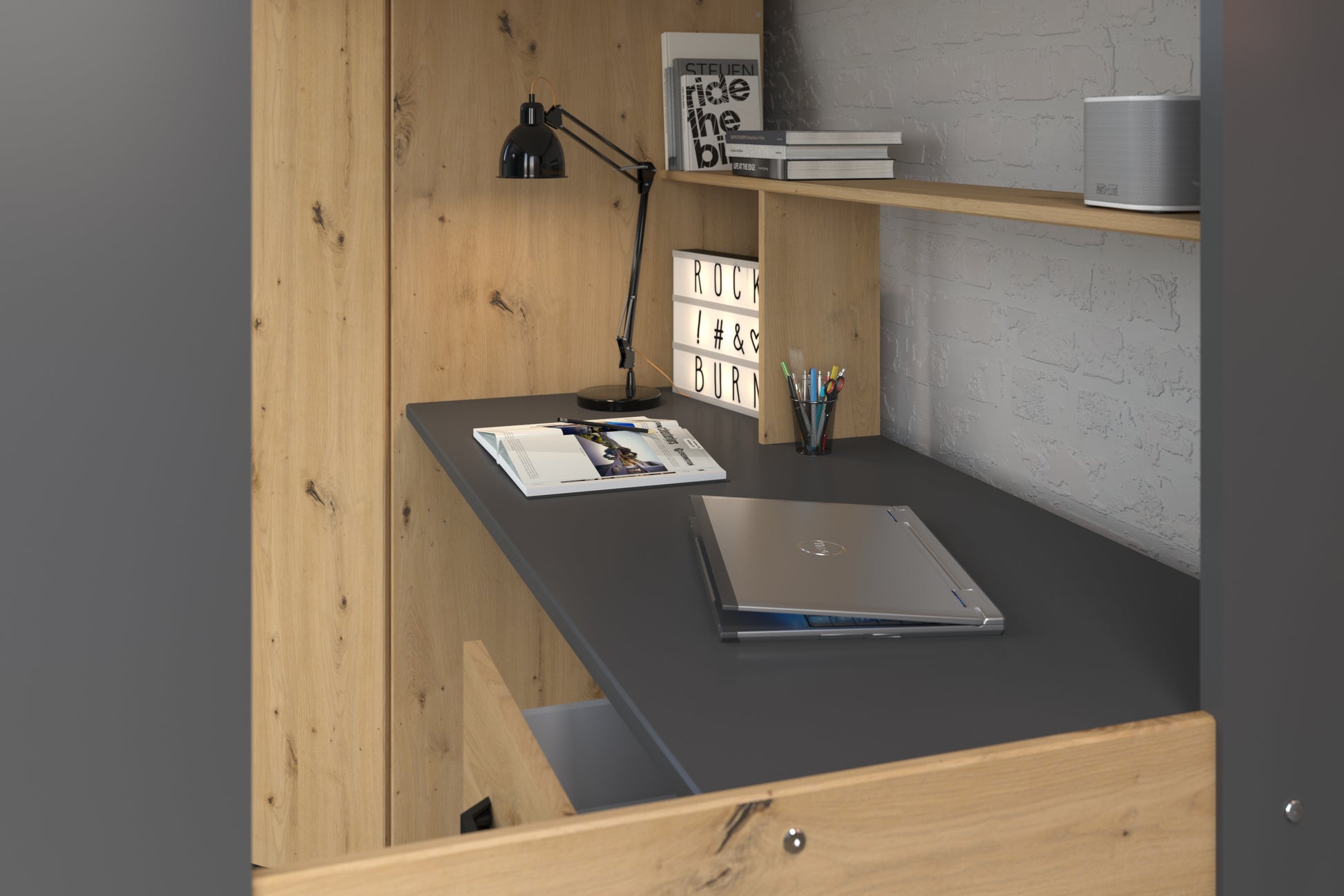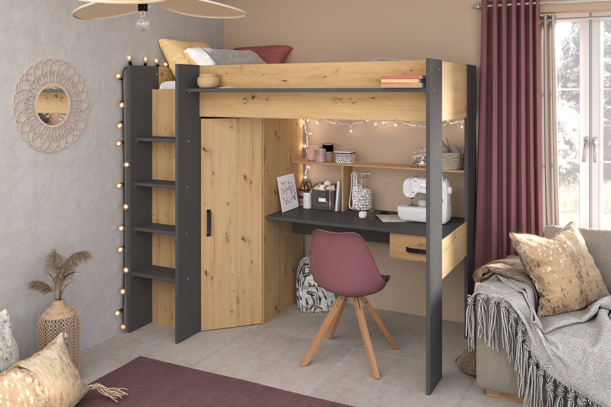 The Parisot Grayson Highsleeper is an ideal place for study or Gaming. With storage shelving and a built in desk under the bed it will create the perfect environment for bedroom space saving and work or play. The ladder on the left hand side of the bed provides easy access to the sleeping area. Wardrobe storage behind the ladder is both discrete and practical complete with hanging rail and is situated at the back left of the bed. A drawer included is convenient for pens and essentials perfect for teenagers or students.