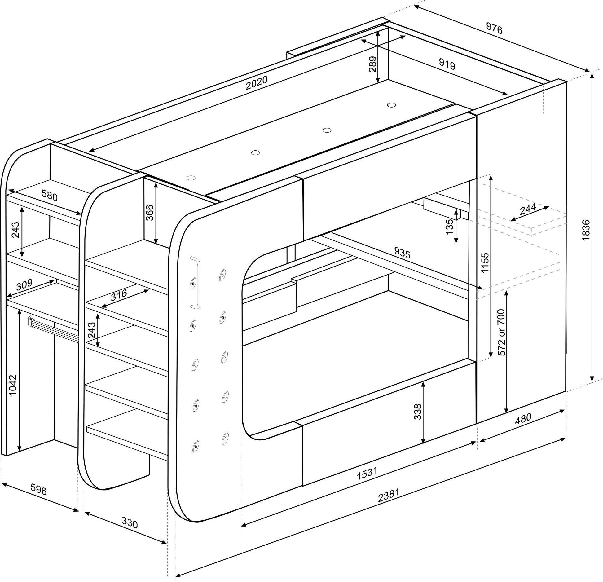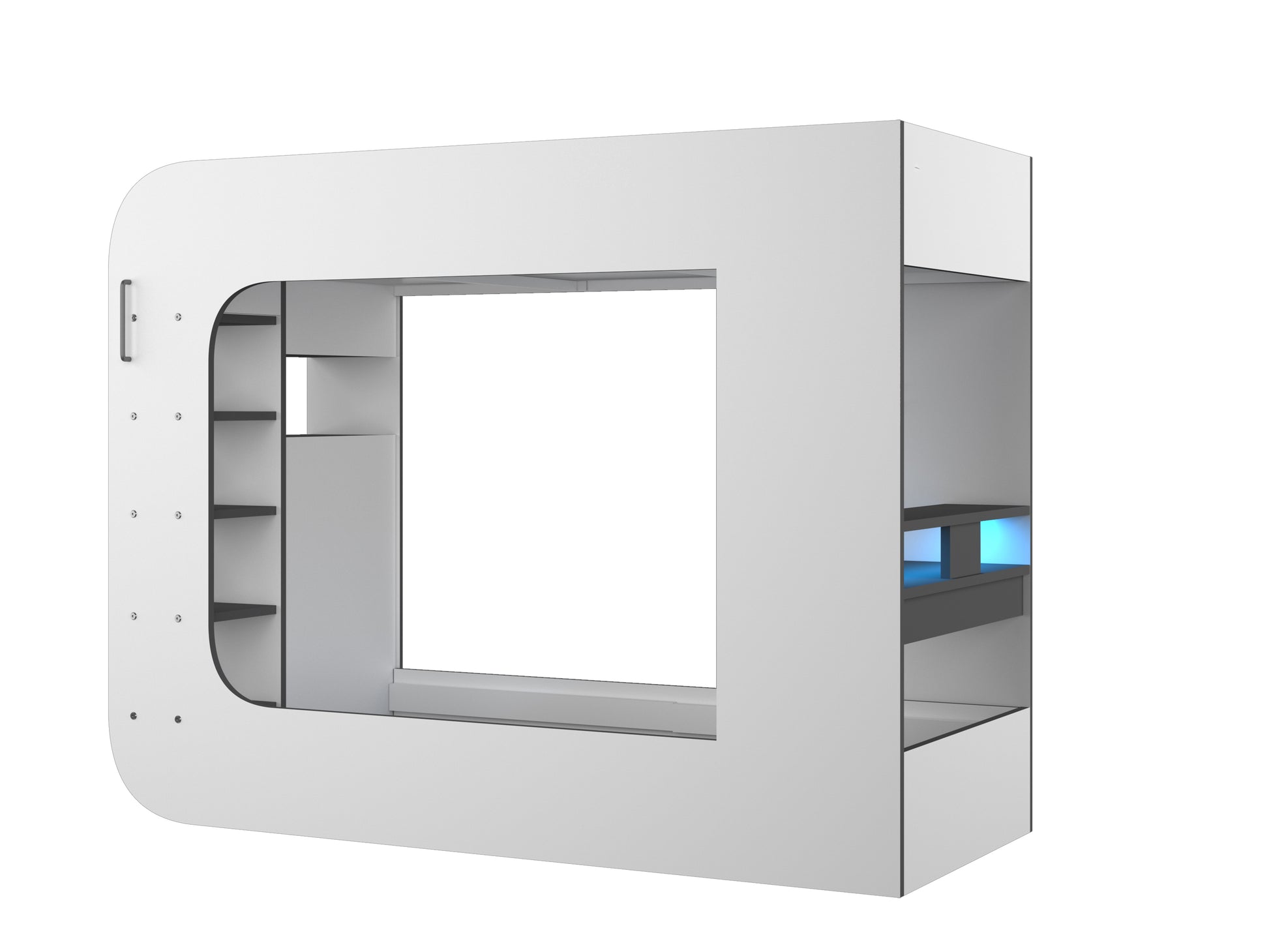 The black bed has a built-in desk with LED strip lighting that illuminates the work area. There is also an open wardrobe and shelving to the end of the bed, as well as ladder access to the sleep zone. This bed is perfect for sleepovers, as it provides plenty of space for guests to relax and play games.
