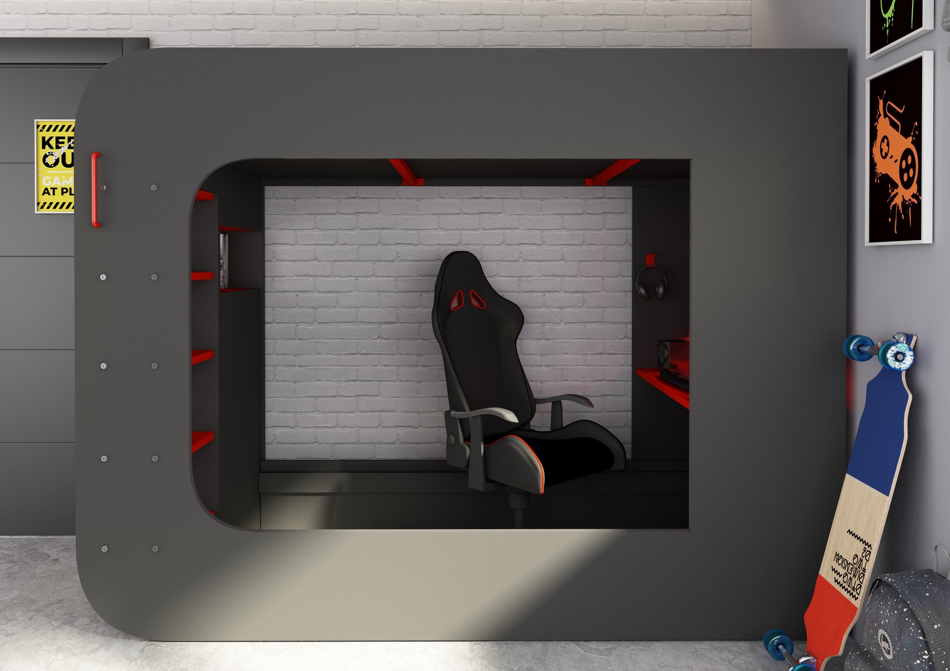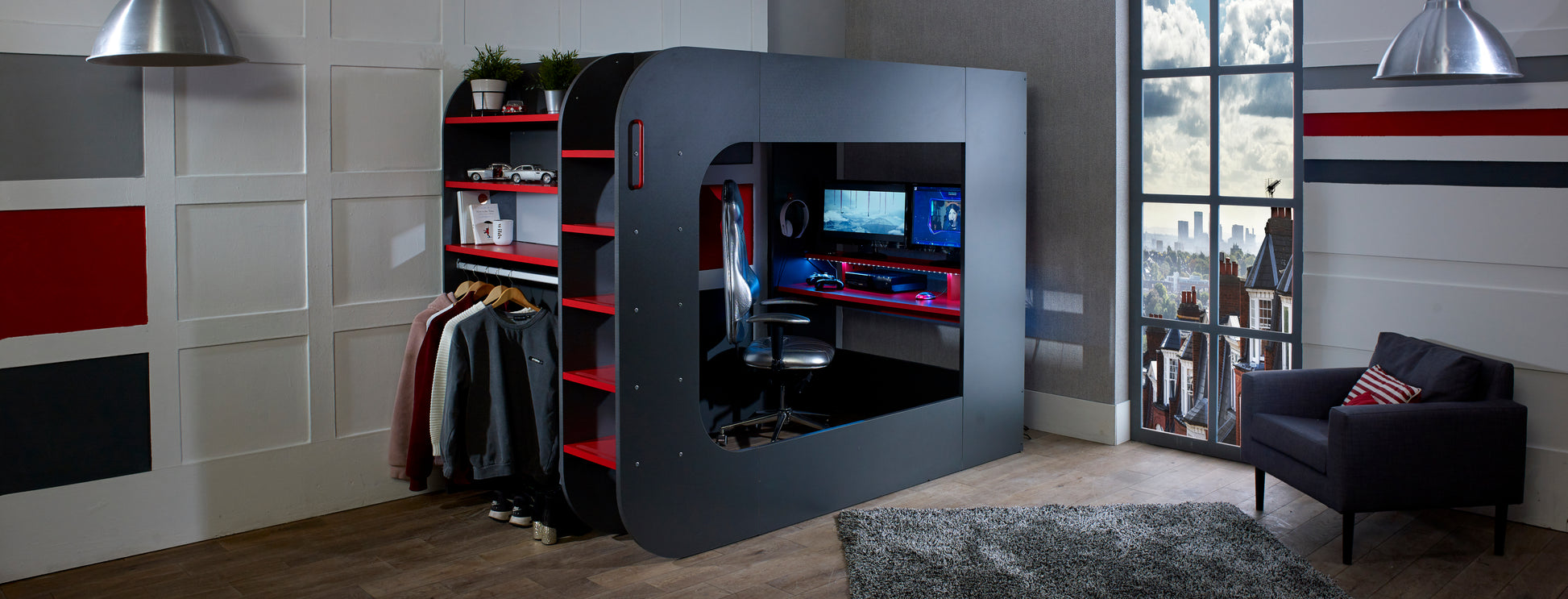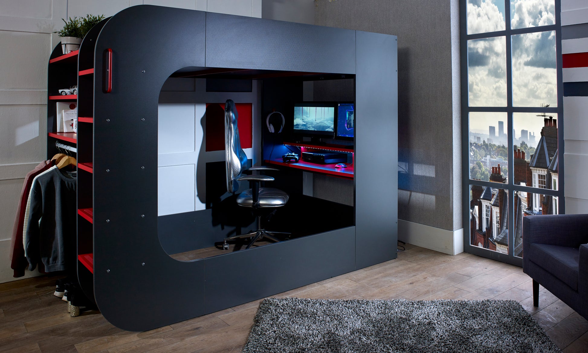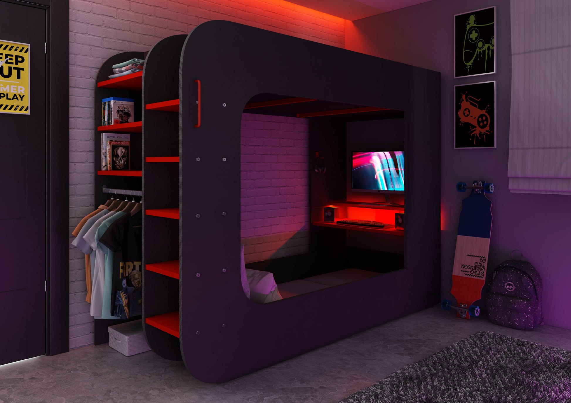This fantastic gaming bed is the perfect way to fully immerse yourself in the experience. With its built-in desk, LED strip lighting, and under-bed lounge space, this bed is designed for teens who want to have the ultimate gaming experience.