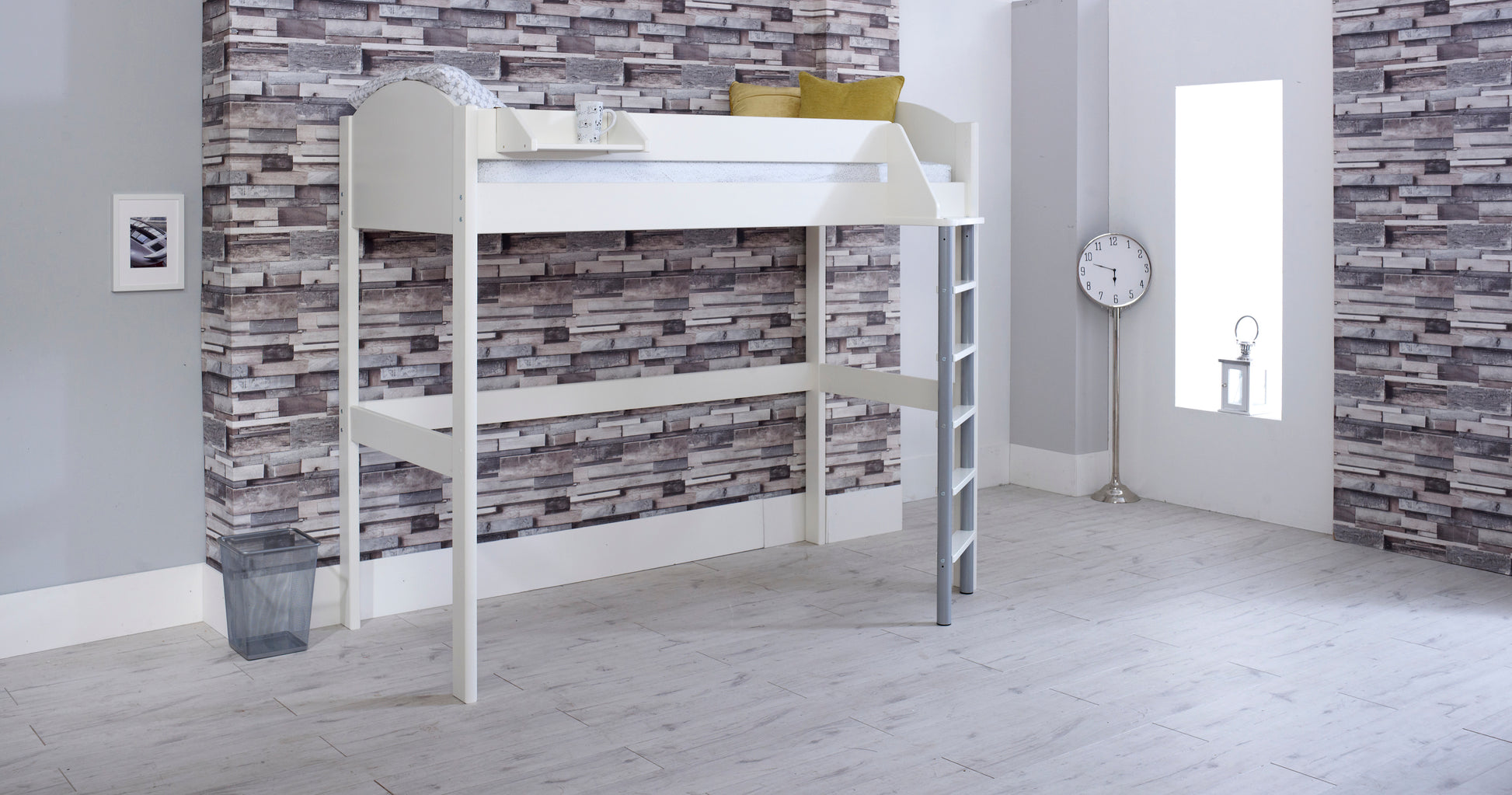 The Noah loft bed offers a place to sleep, relax and work. It features a rigid bedframe with sleeping bunk, with a fixed desk and sofa bed below. The top bunk is accessed via a tubular metal and wood ladder which can be set-up when assembling, along with the sofa and desk, on either end of the bed, as required (mirror image). The bedframe is made from solid Scandinavian pine in white finish, and the header and footer boards are made from modern MDF in a choice of colours.
