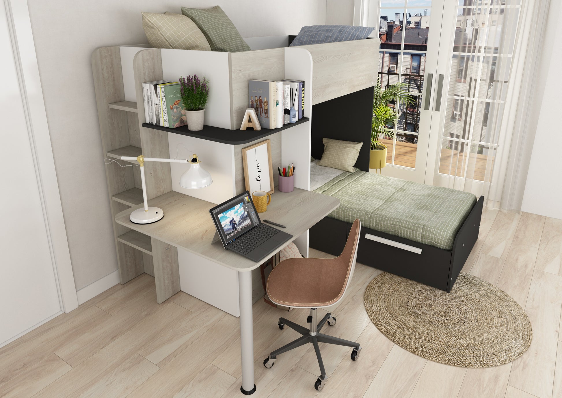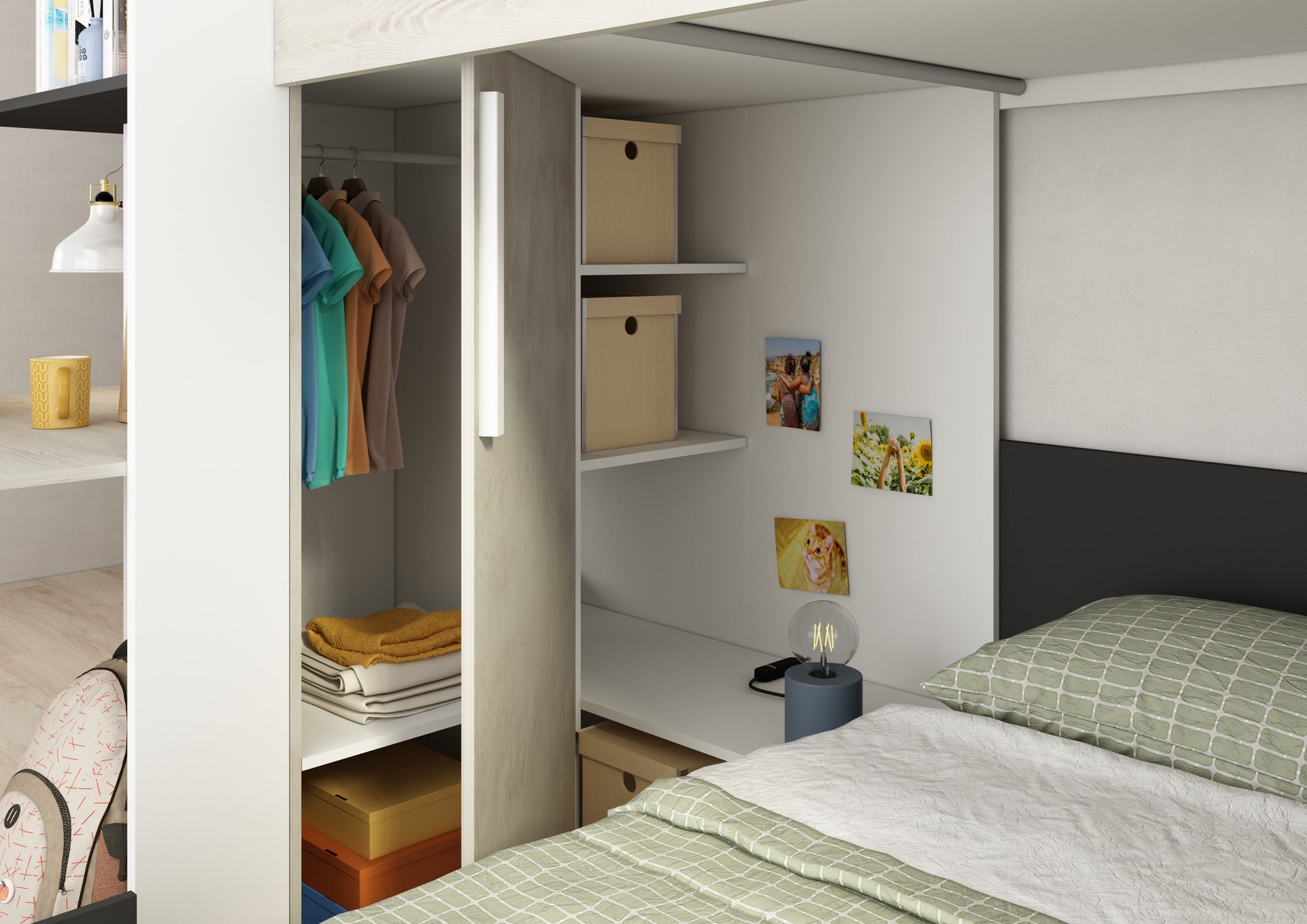 Reversible bunk bed. Ladder and desk can be on the left or right hand side. Bunk bed with wardrobe, desk and a storage unit with 1 drawer on castors and 3 shelves. One of them works as a nightstand. It has a shelf along the side and the foot of the bed, perfect for displaying items. Wardrobe has 1 door, 1 shelf and 1 hanger rail. The desk offers a place to study for 2, W93,8xD45-96 cm. Drawer interior in melamine, white finish. Suitable for 90x190 cm mattresses.