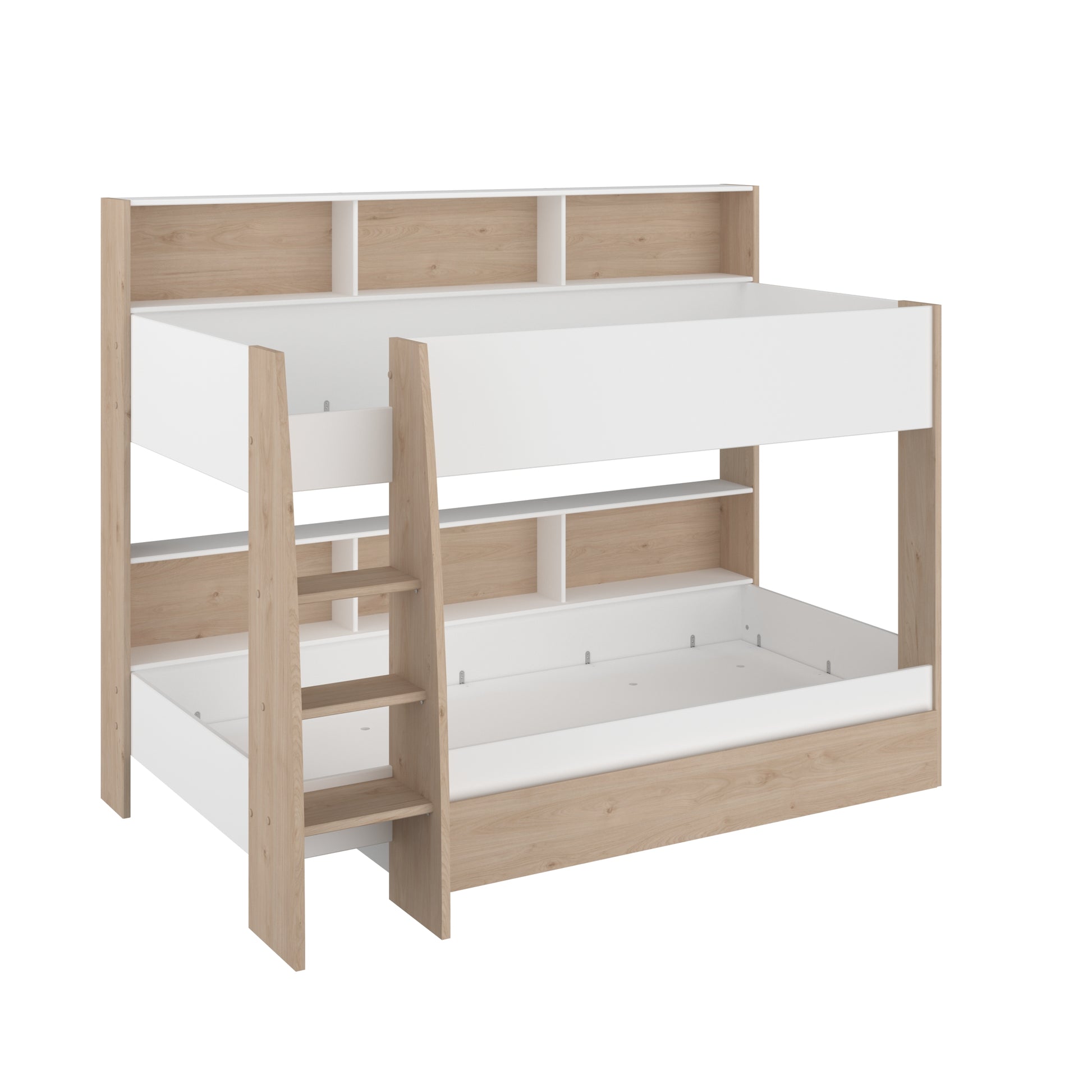 The Parisot Shelter Bunk in White & Oak with Drawer is the perfect option for shared rooms. Providing a modern feel and sturdy construction, this bunk features bedside storage on both the top and bottom bunk alongside an underbed drawer for concealed storage!