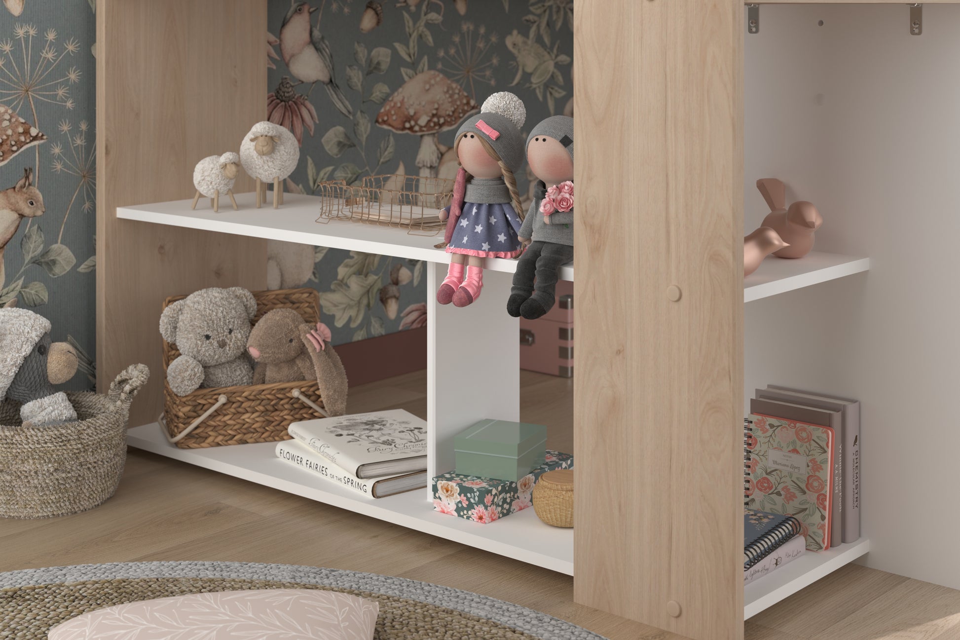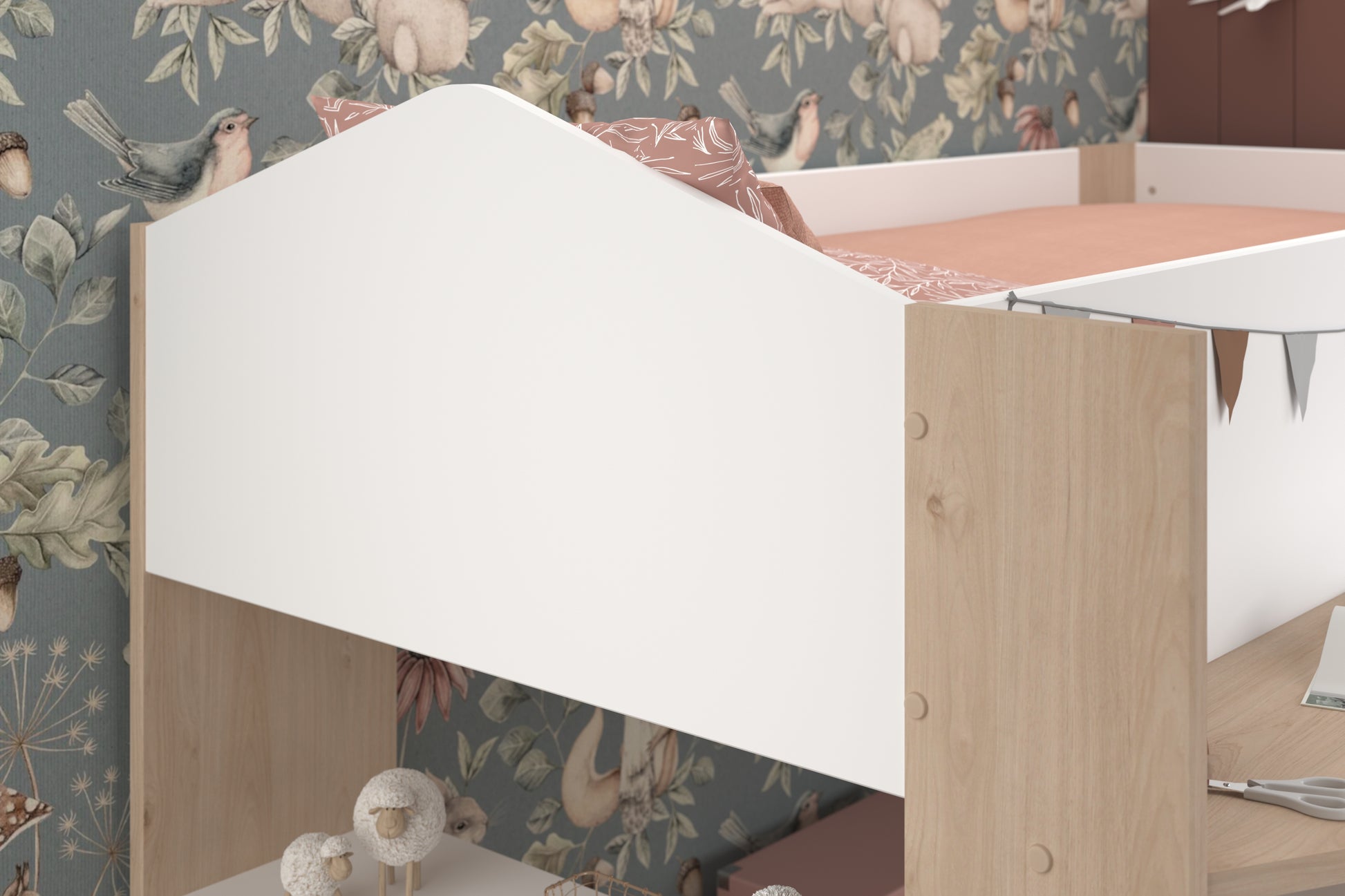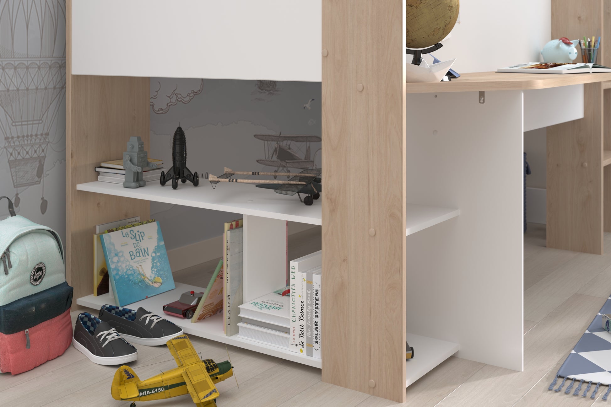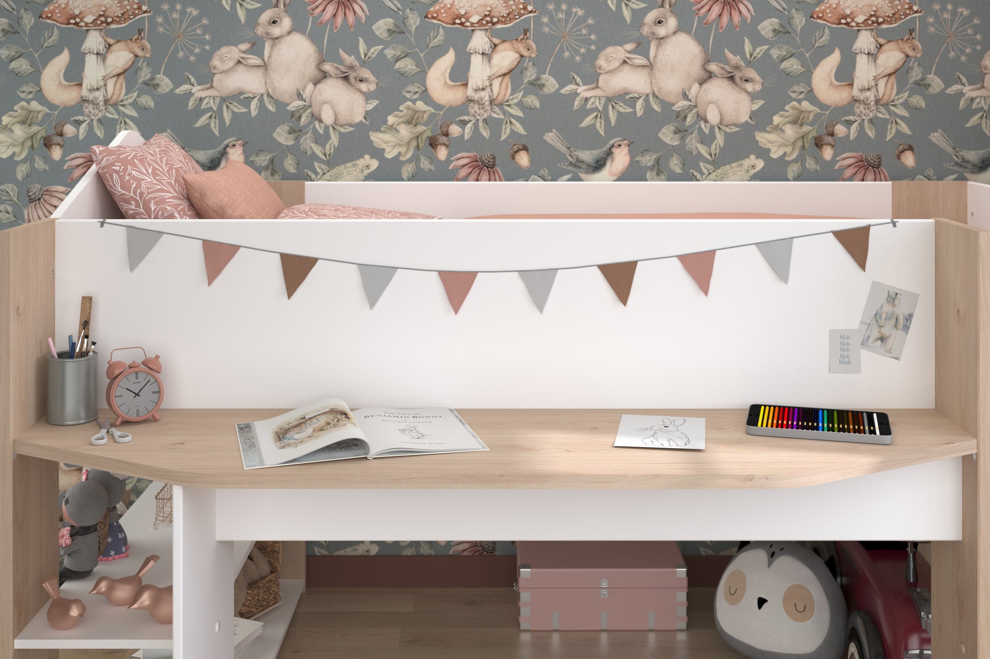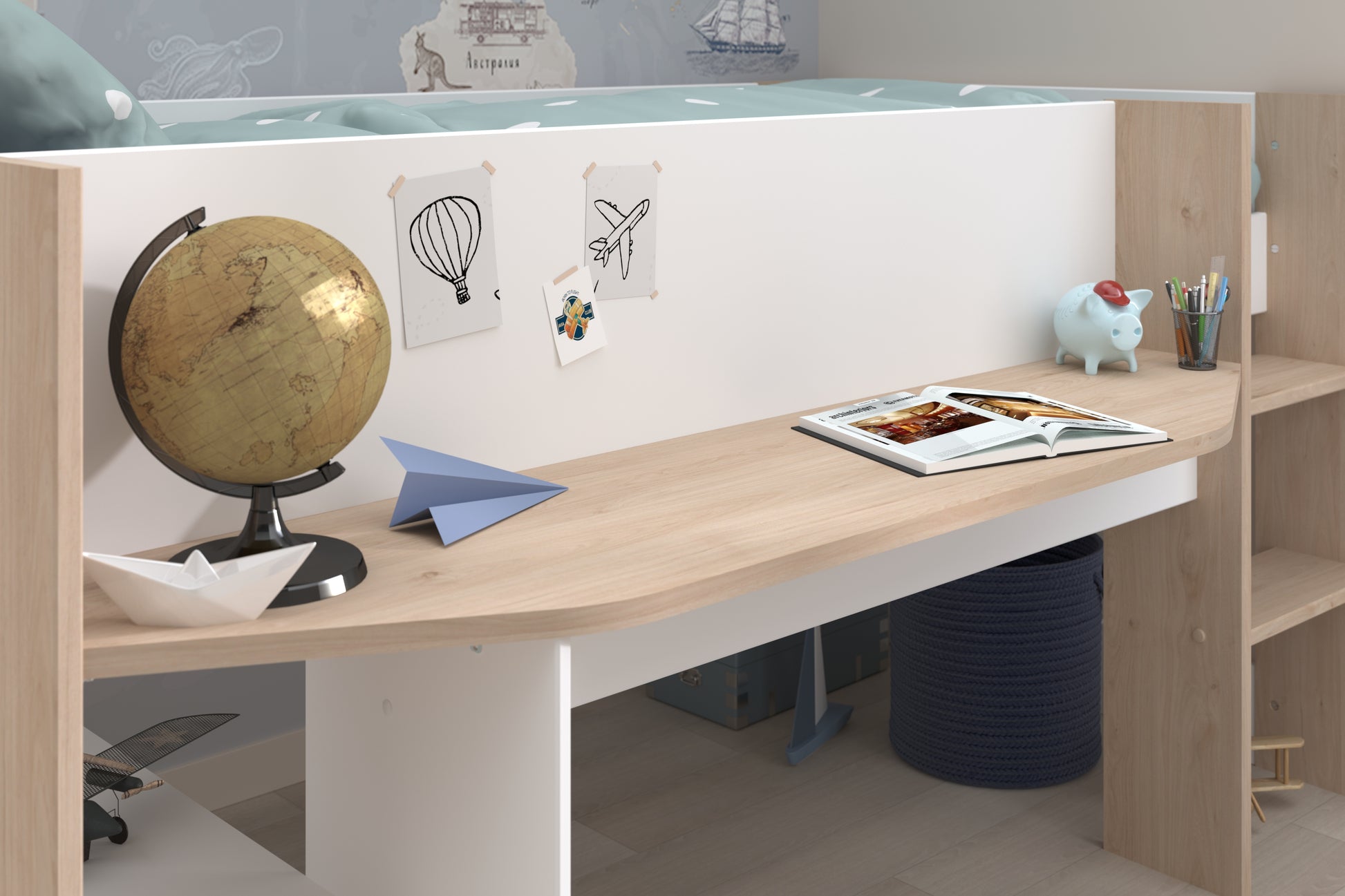 The Shelter Midsleeper is designed for both comfort and space saving and has a comfy Cabin bed on a raised sleeping platform with integral steps to gain access. The ladder is equipped with larger steps for a safer journey. The smaller room would benefit from this new midsleeper, it provides space below the bed and has 2 storage shelves ideal for storing essentials. A built in integral desk can be used for Gaming and study and can easily be stored under the bed or alone elsewhere in the room. With a solid bed base the product has a fresh and clean white and oak finish and is a strong high density particleboard which is delivered flat packed