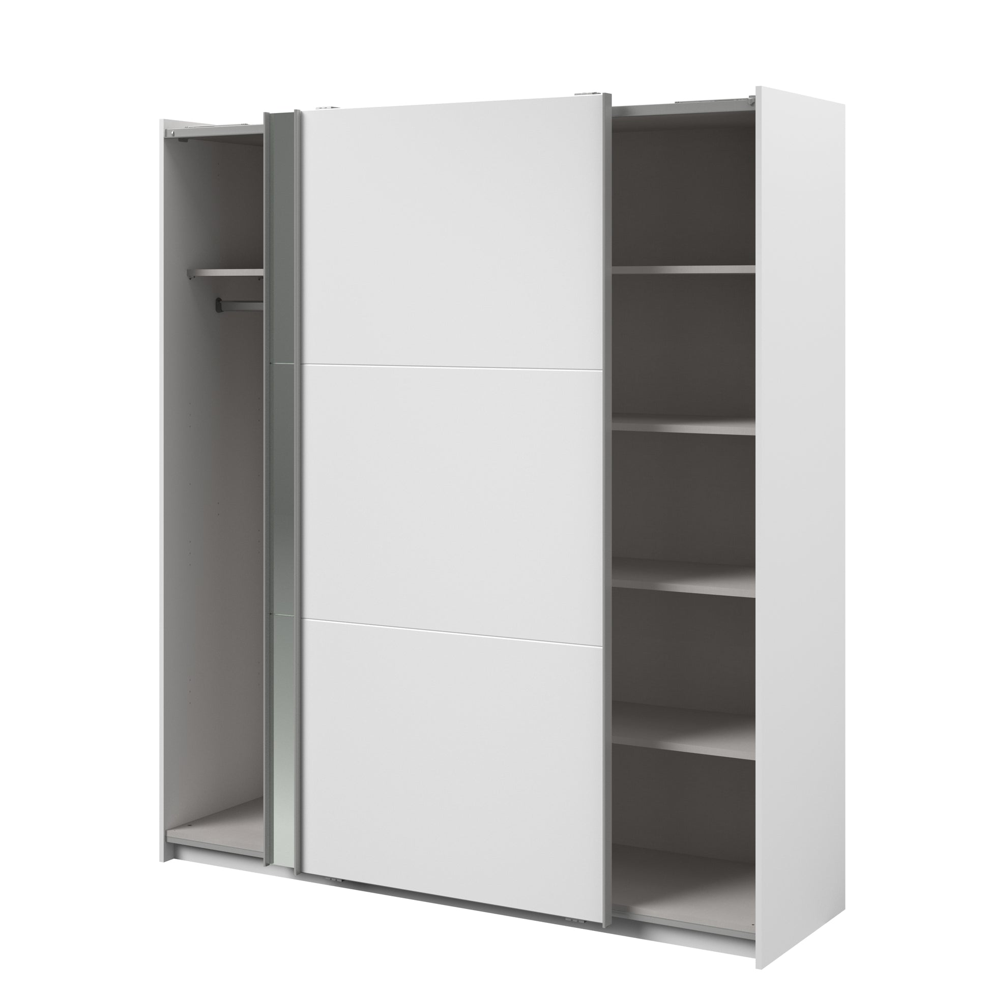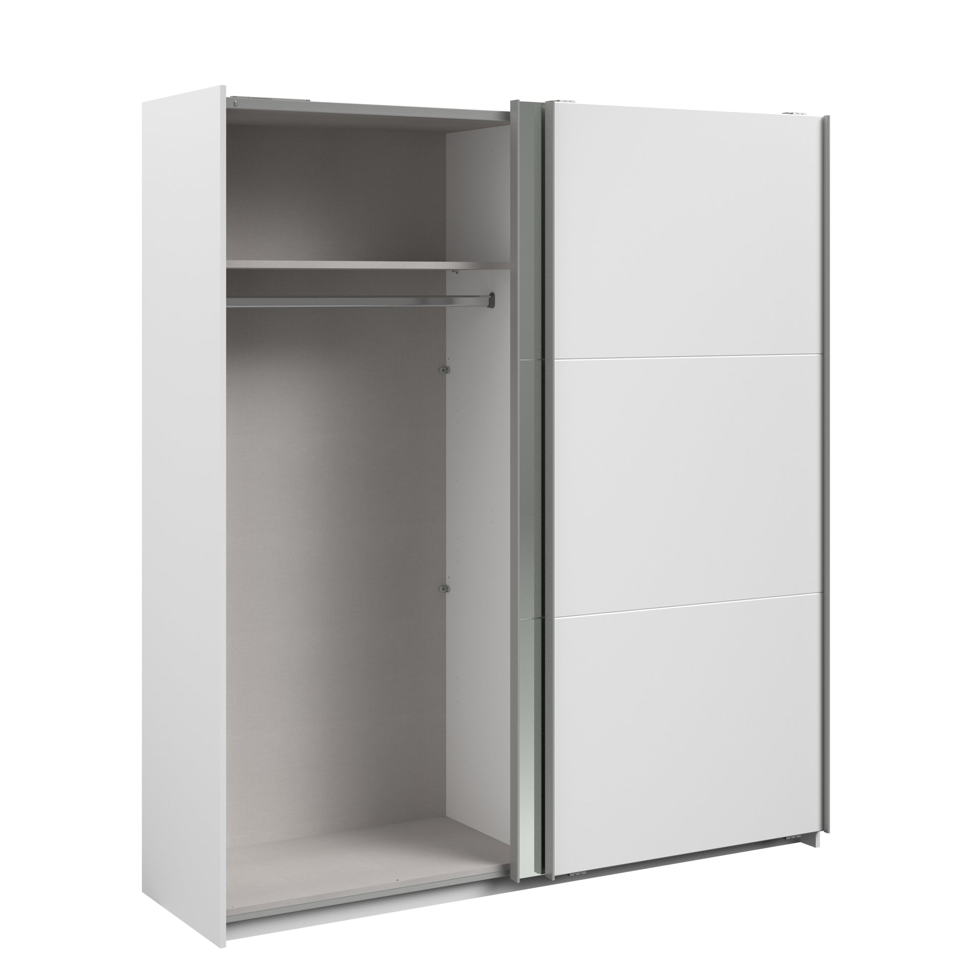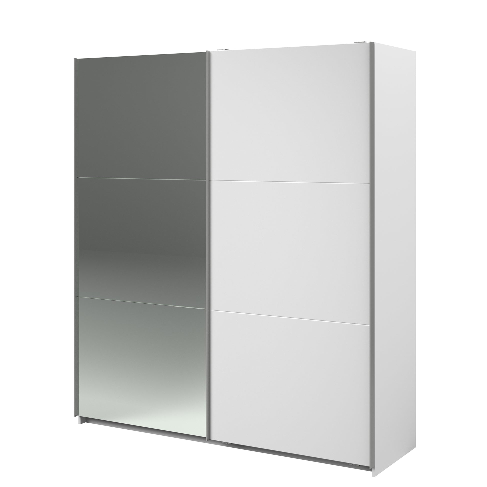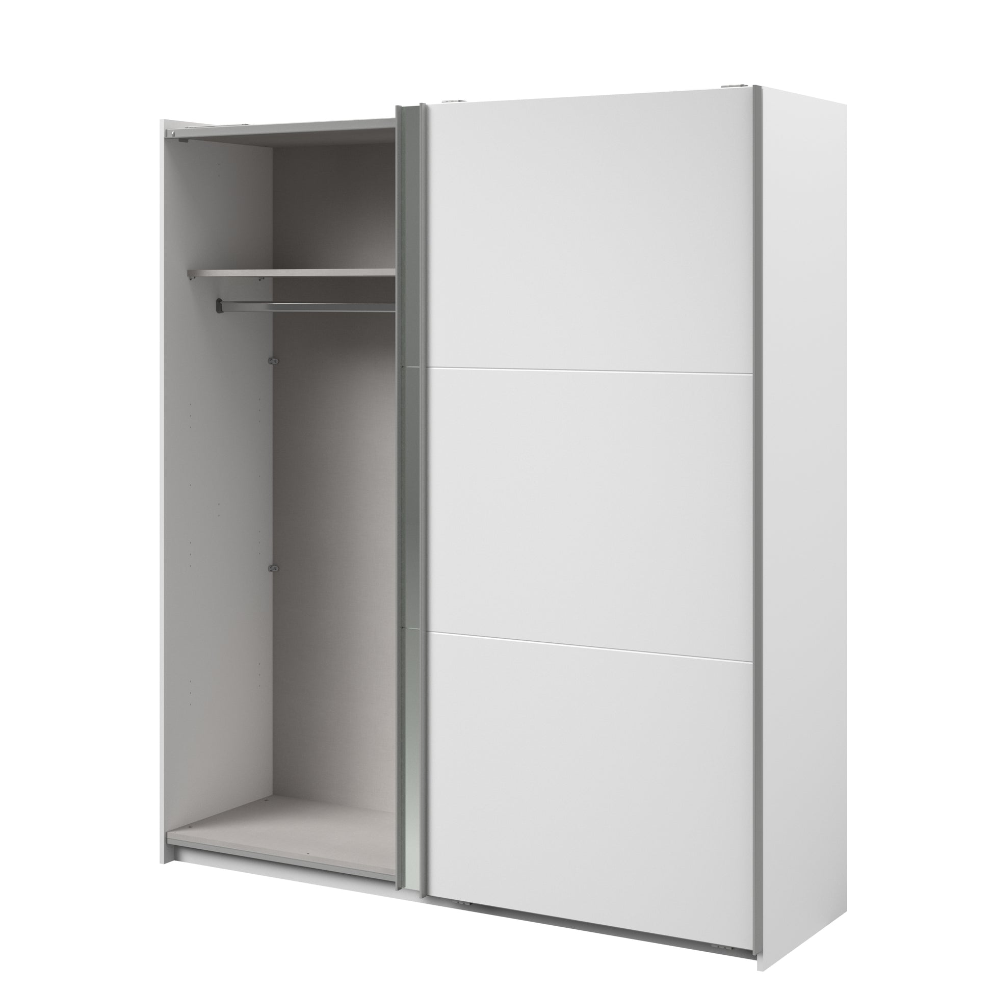 Parisot white mirrored finish wardrobe with sliding doors. One side is hanging the other is shelves and can be reversed. There are 6 options for internal layout. Easy roll soft close mechanism. Smooth action sliding doors. Can be assembled on delivery if required. In stock for fast free delivery every postcode in the UK within 2 weeks!