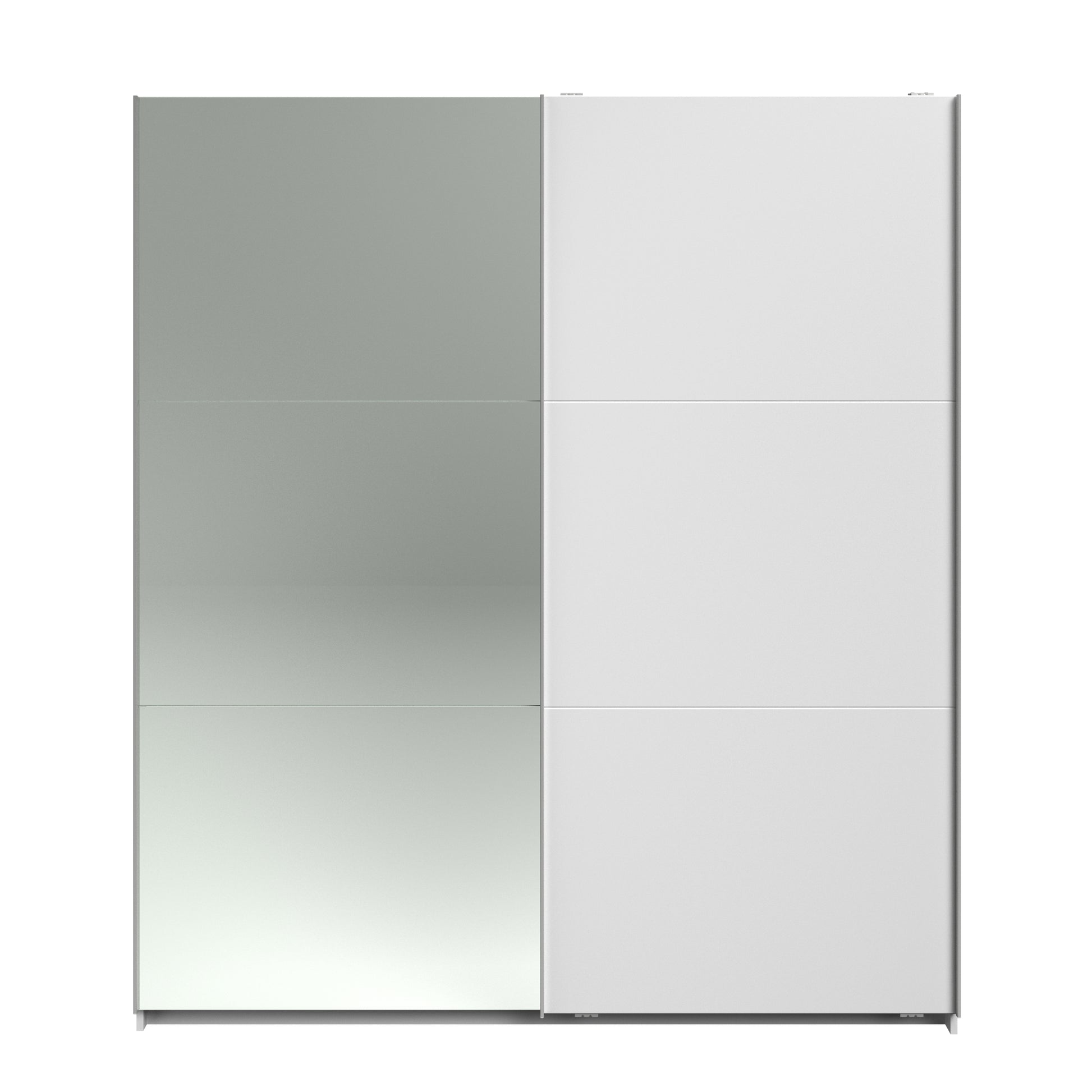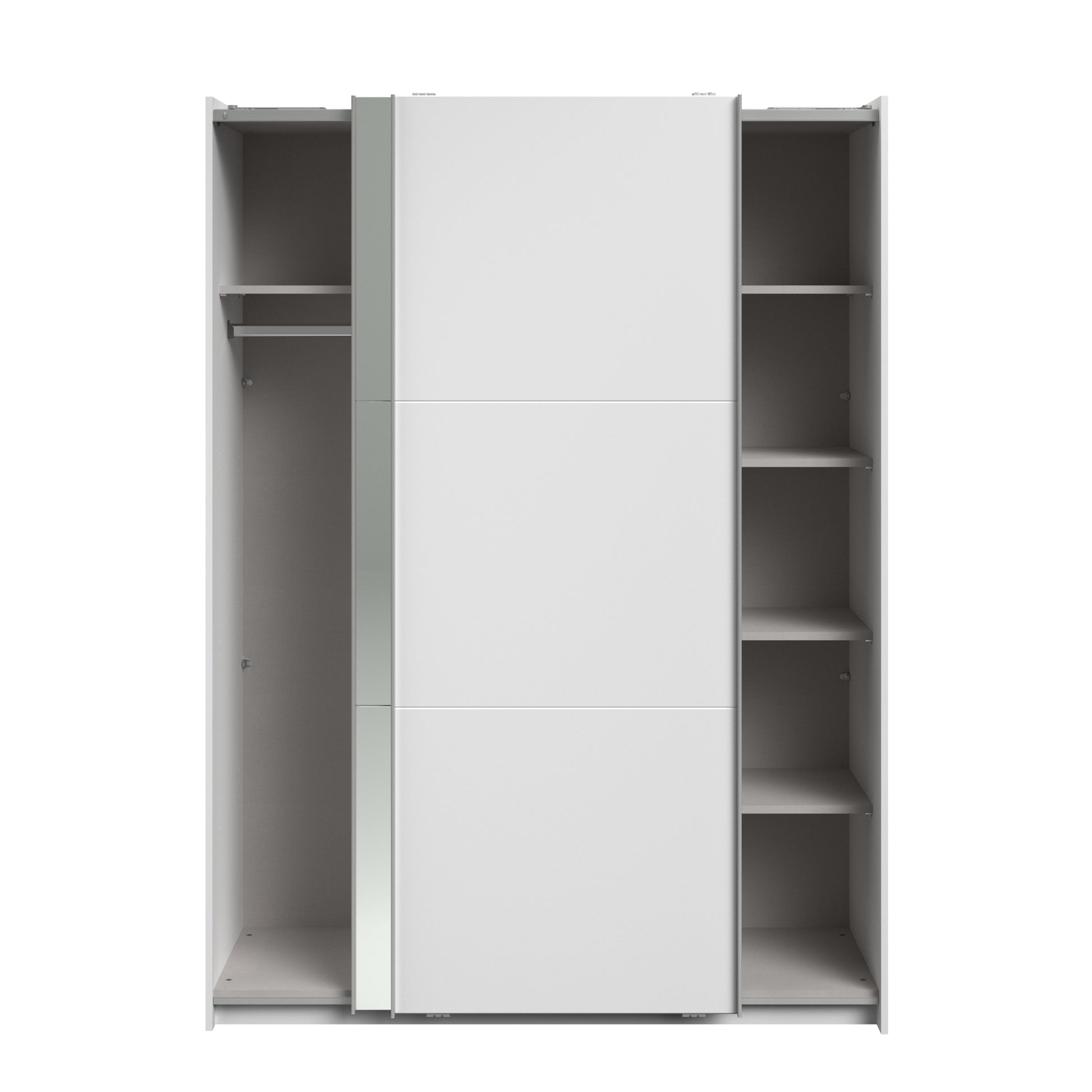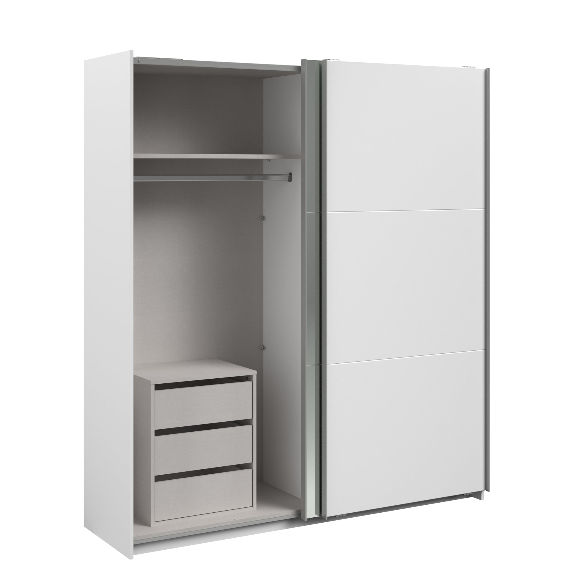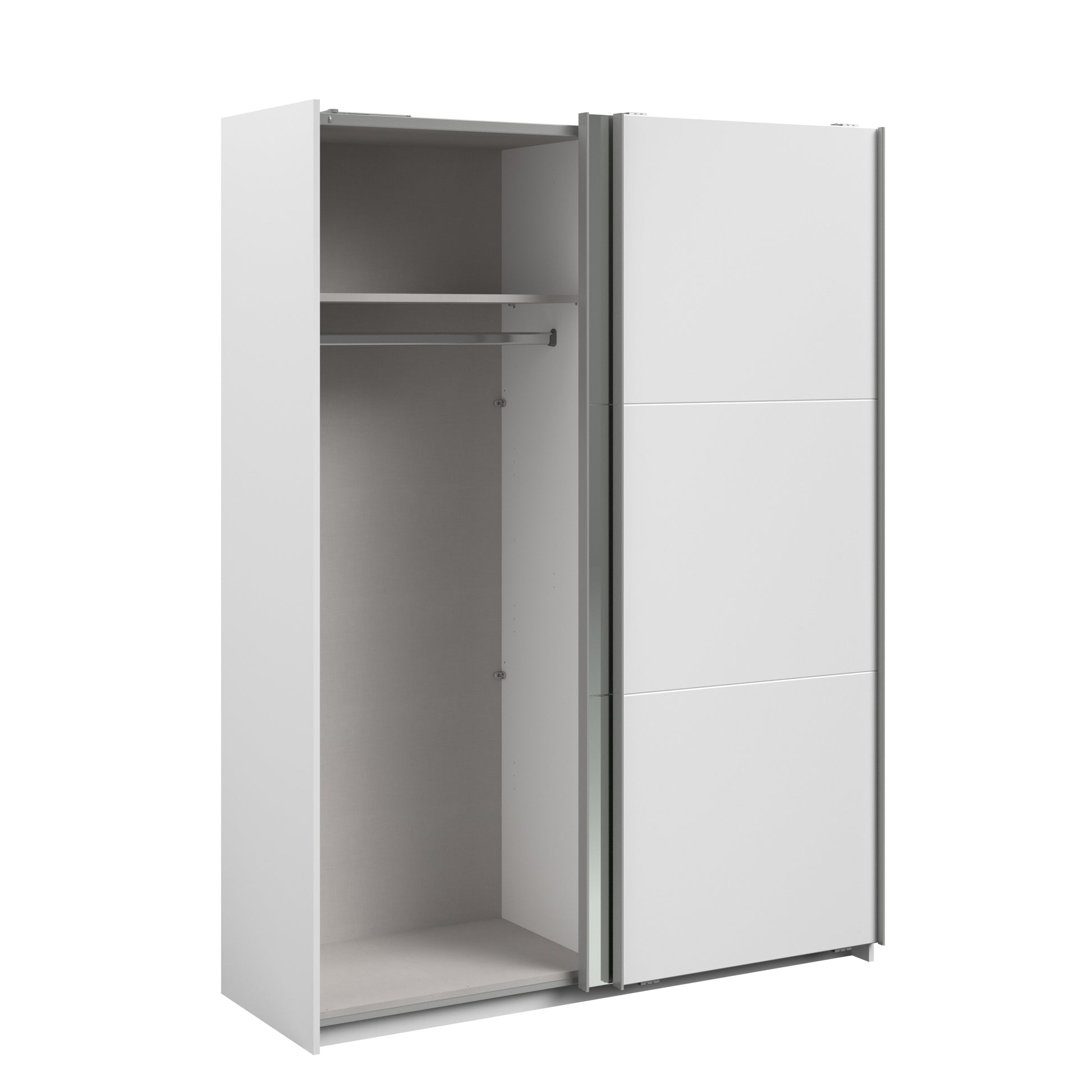 Parisot white mirrored finish wardrobe with sliding doors. One side is hanging the other is shelves and can be reversed. There are 6 options for internal layout. Easy roll soft close mechanism. Smooth action sliding doors. Can be assembled on delivery if required. In stock for fast free delivery every postcode in the UK within 2 weeks!