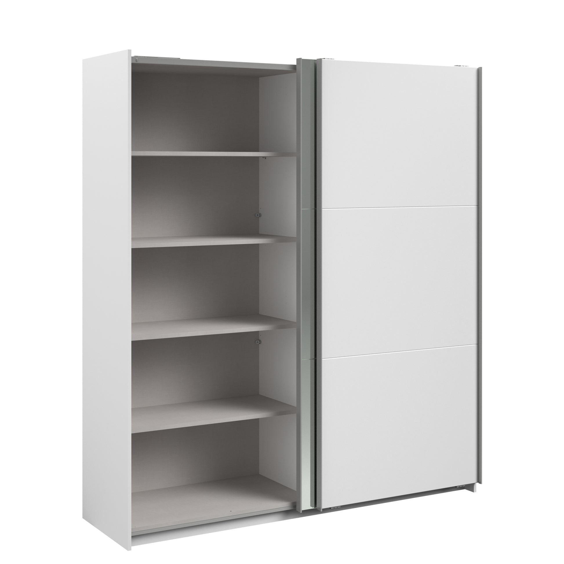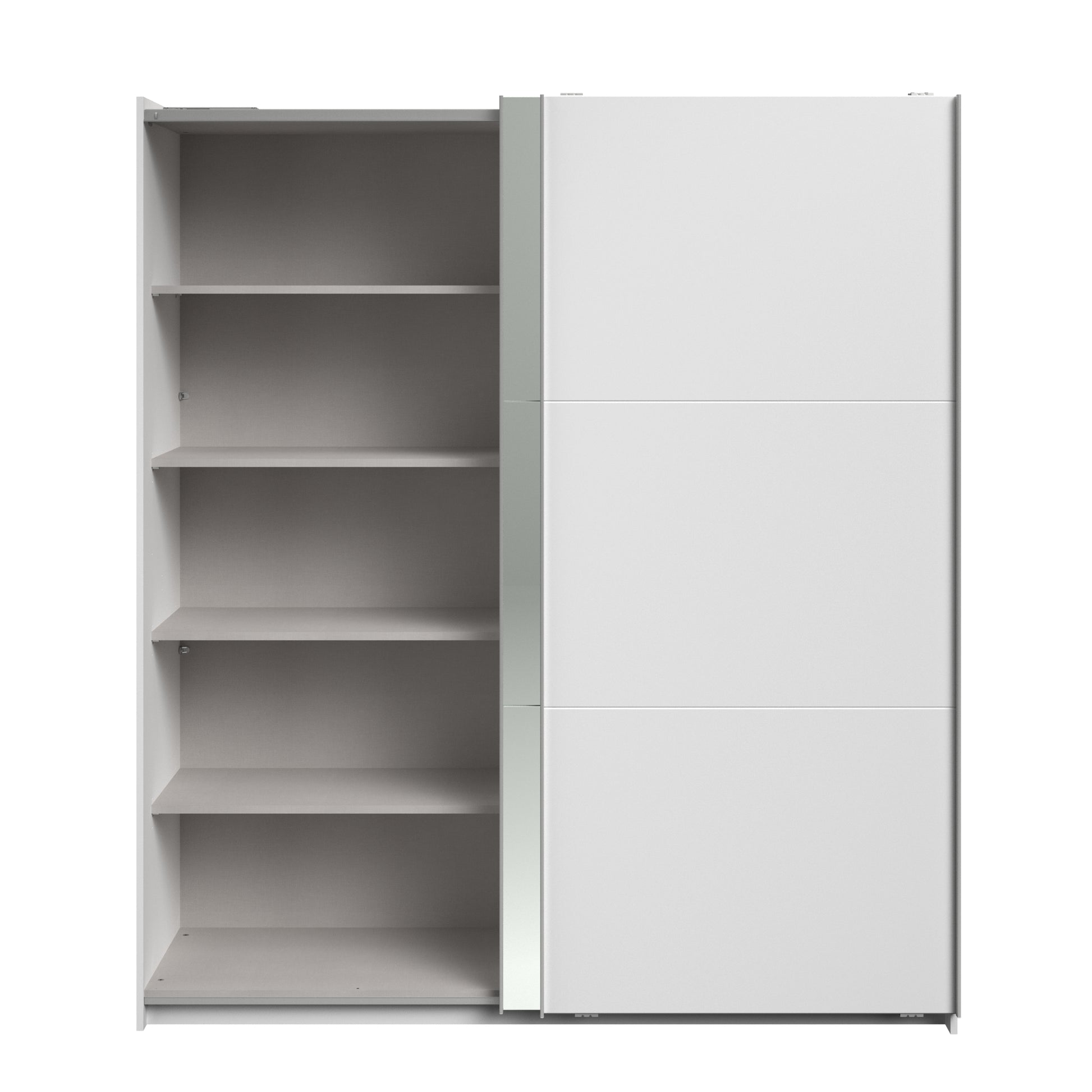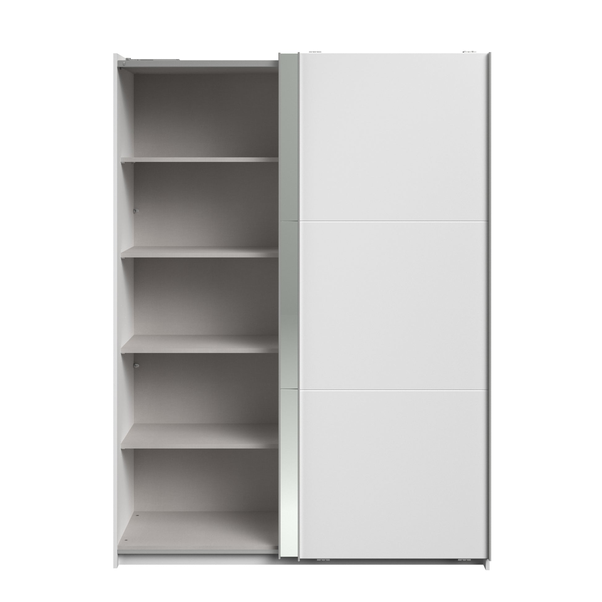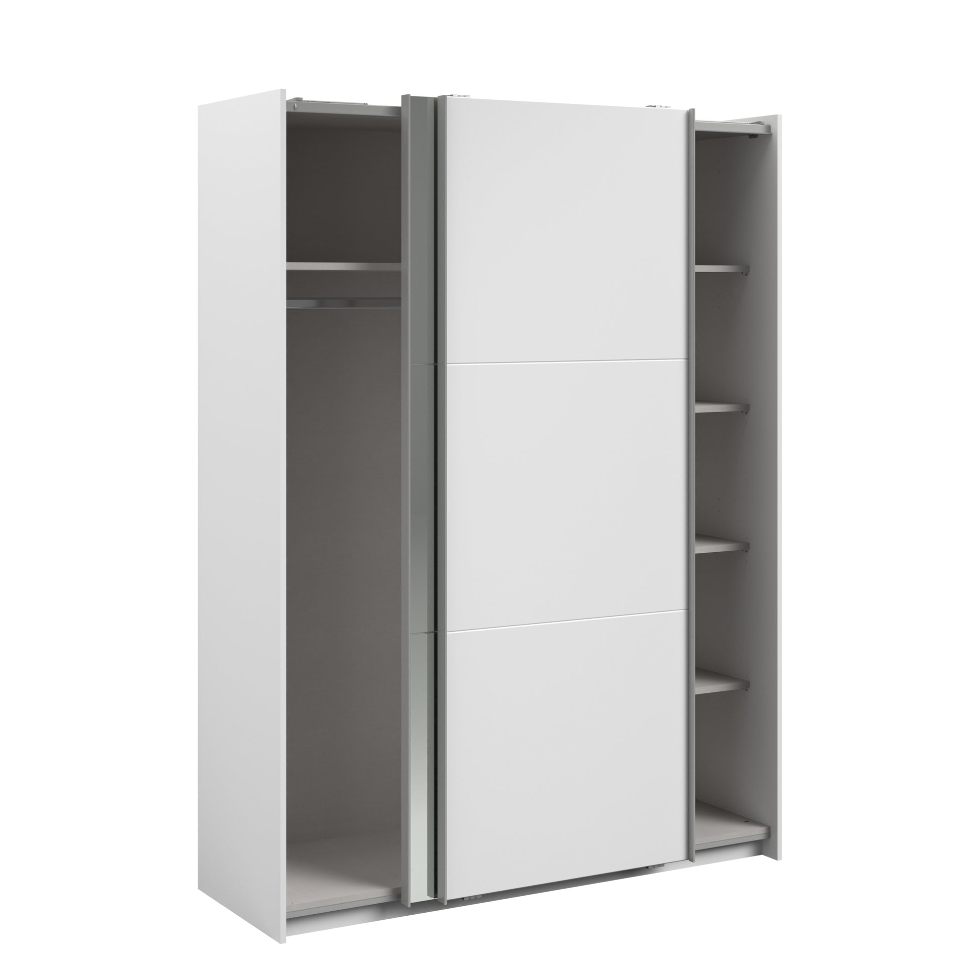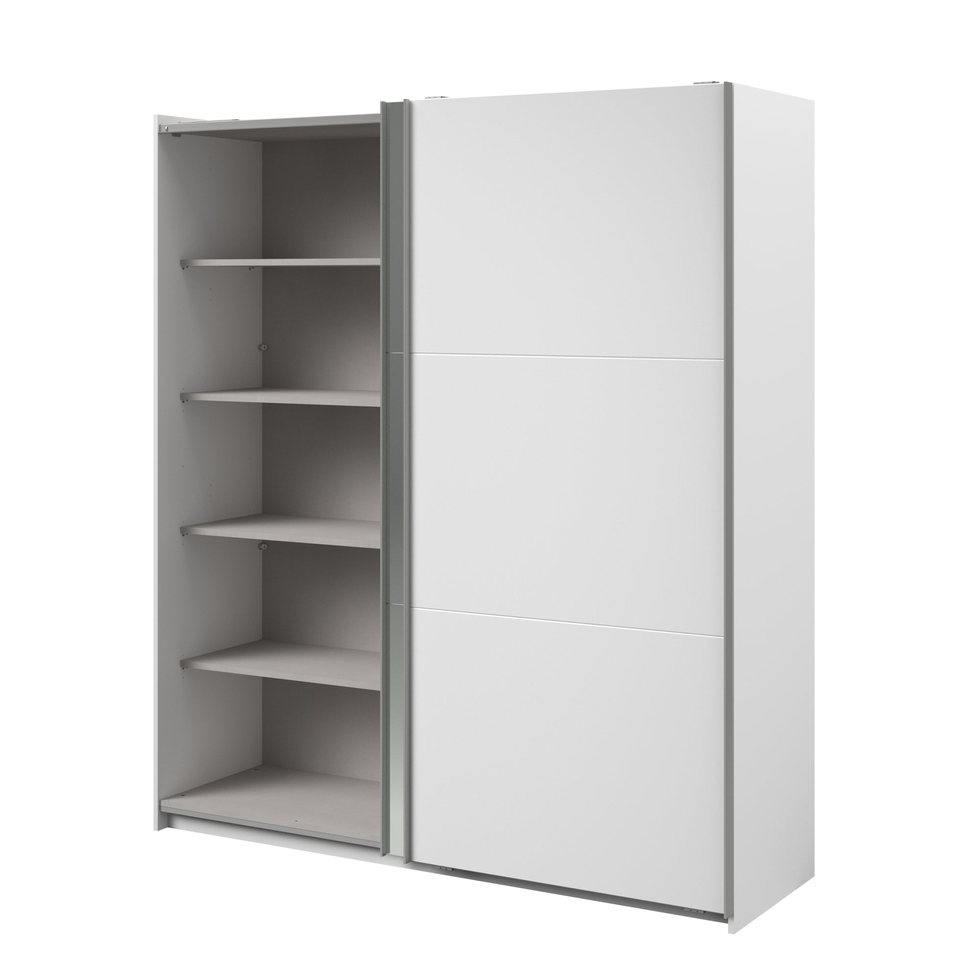 Parisot white mirrored finish wardrobe with sliding doors. One side is hanging the other is shelves and can be reversed. There are 6 options for internal layout. Easy roll soft close mechanism. Smooth action sliding doors. Can be assembled on delivery if required. In stock for fast free delivery every postcode in the UK within 2 weeks!