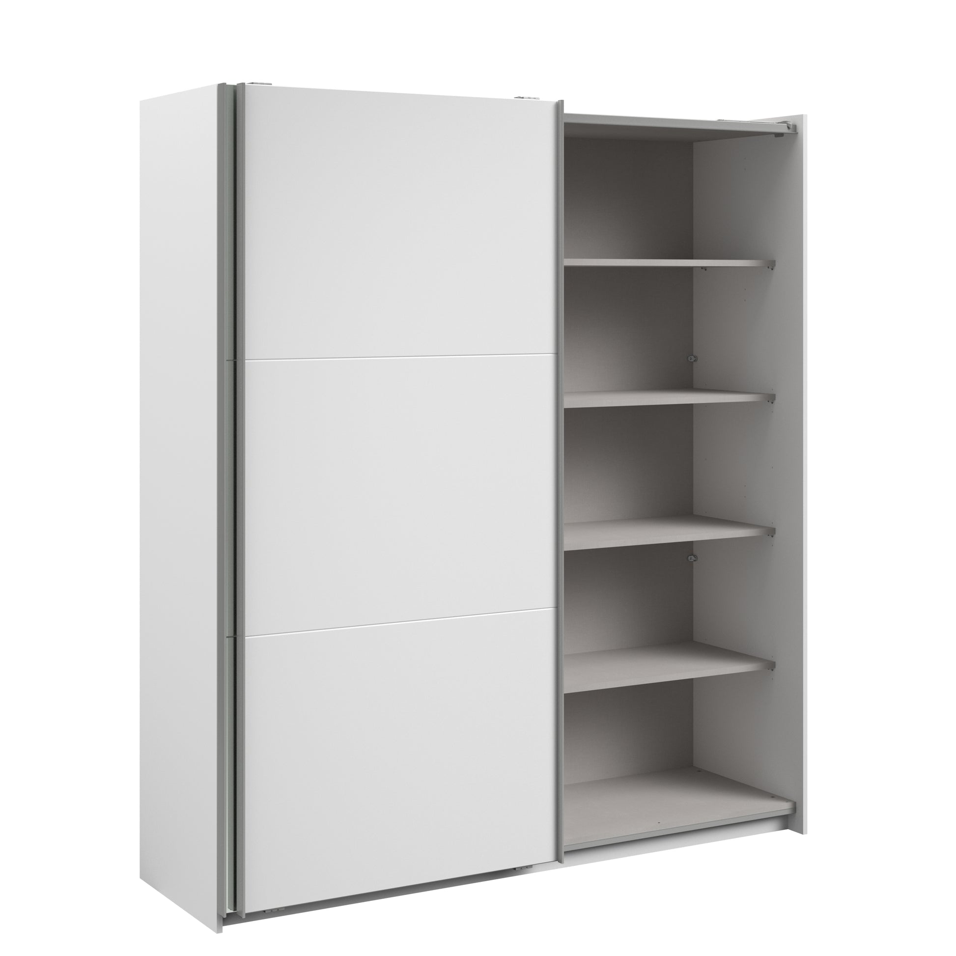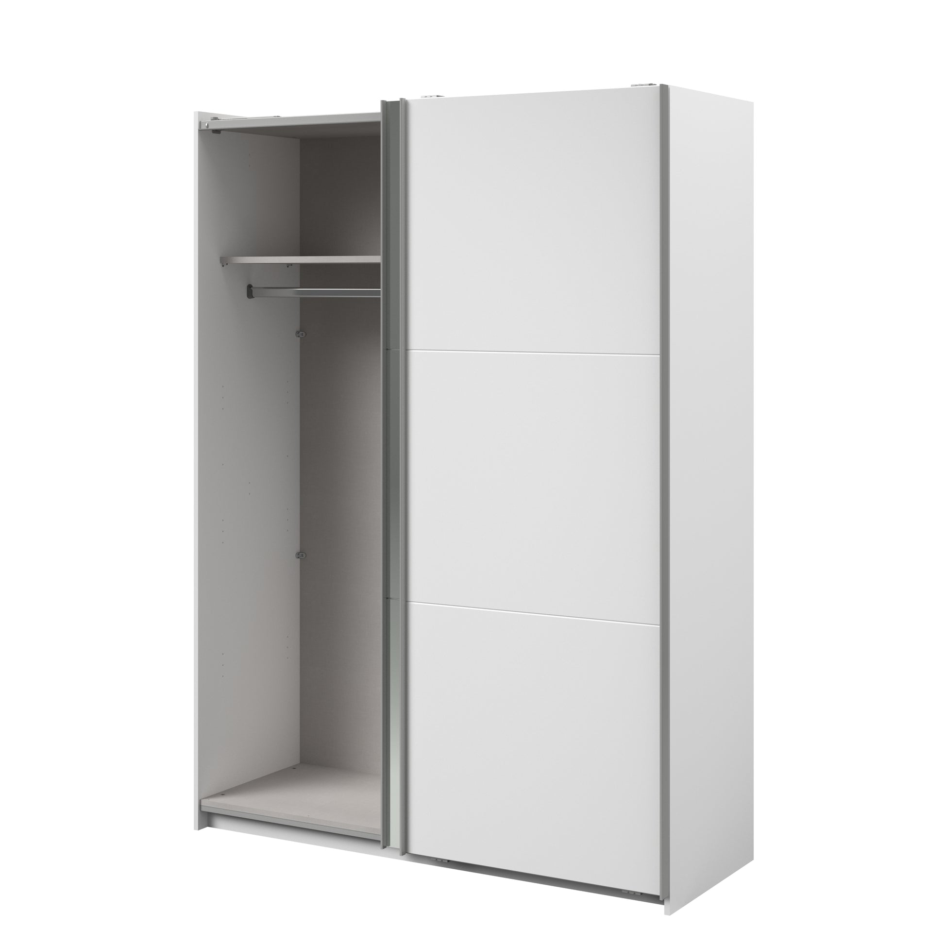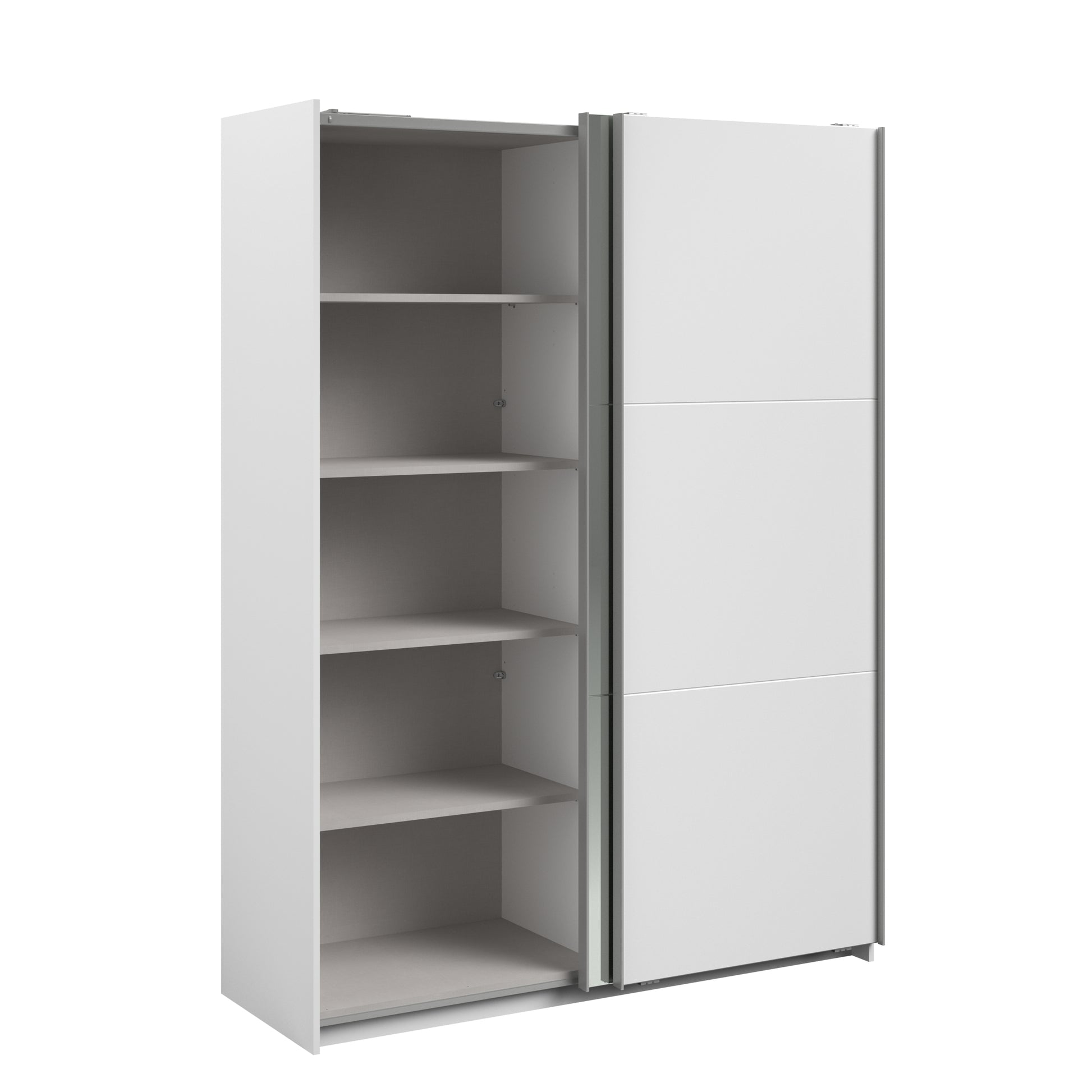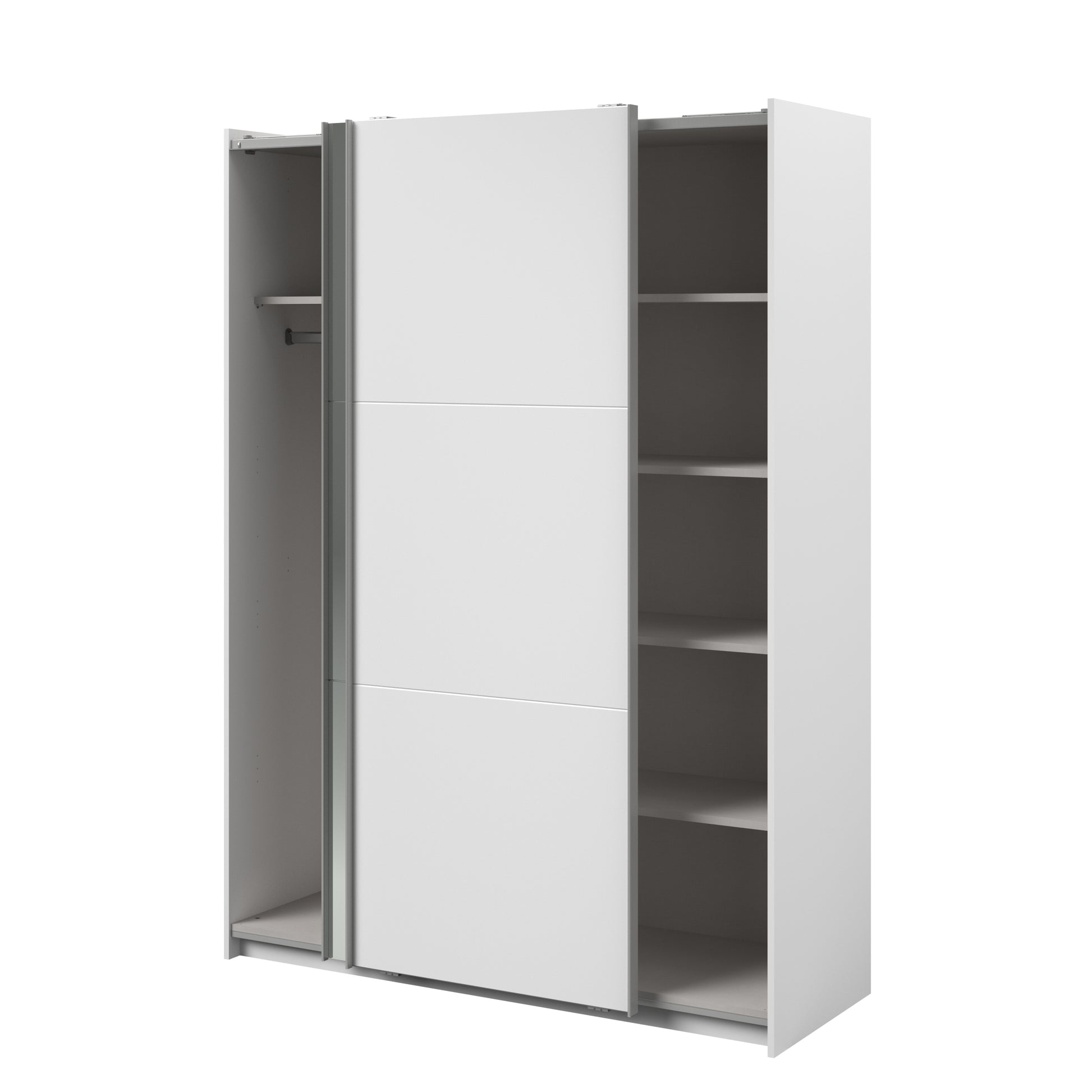 Parisot white mirrored finish wardrobe with sliding doors. One side is hanging the other is shelves and can be reversed. There are 6 options for internal layout. Easy roll soft close mechanism. Smooth action sliding doors. Can be assembled on delivery if required. In stock for fast free delivery every postcode in the UK within 2 weeks!