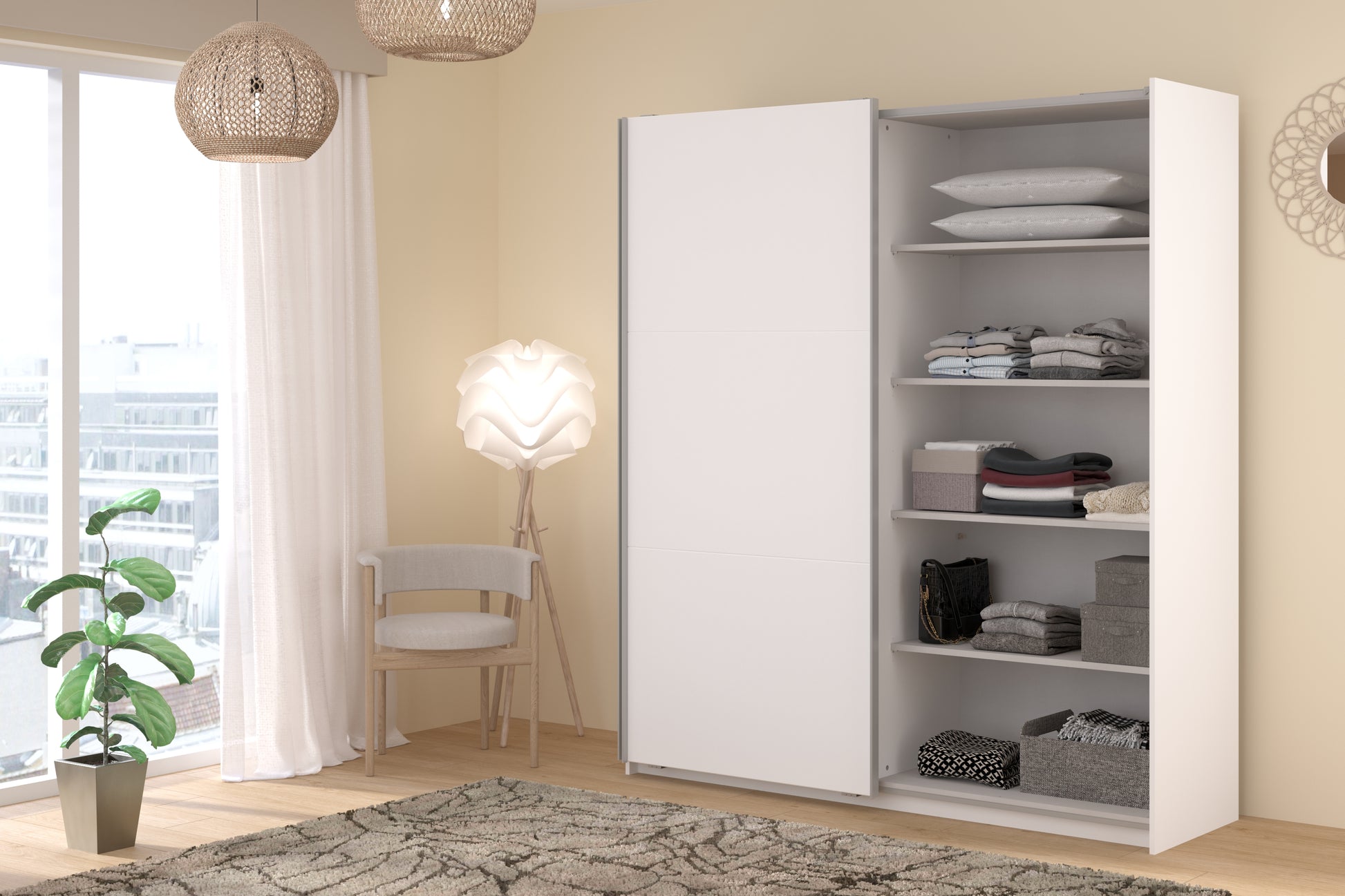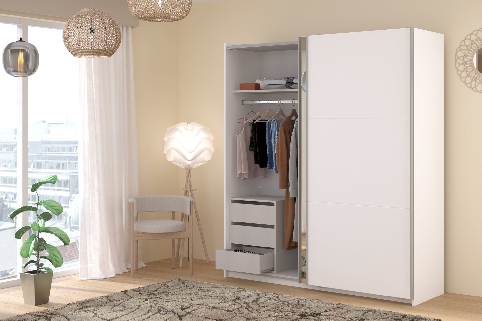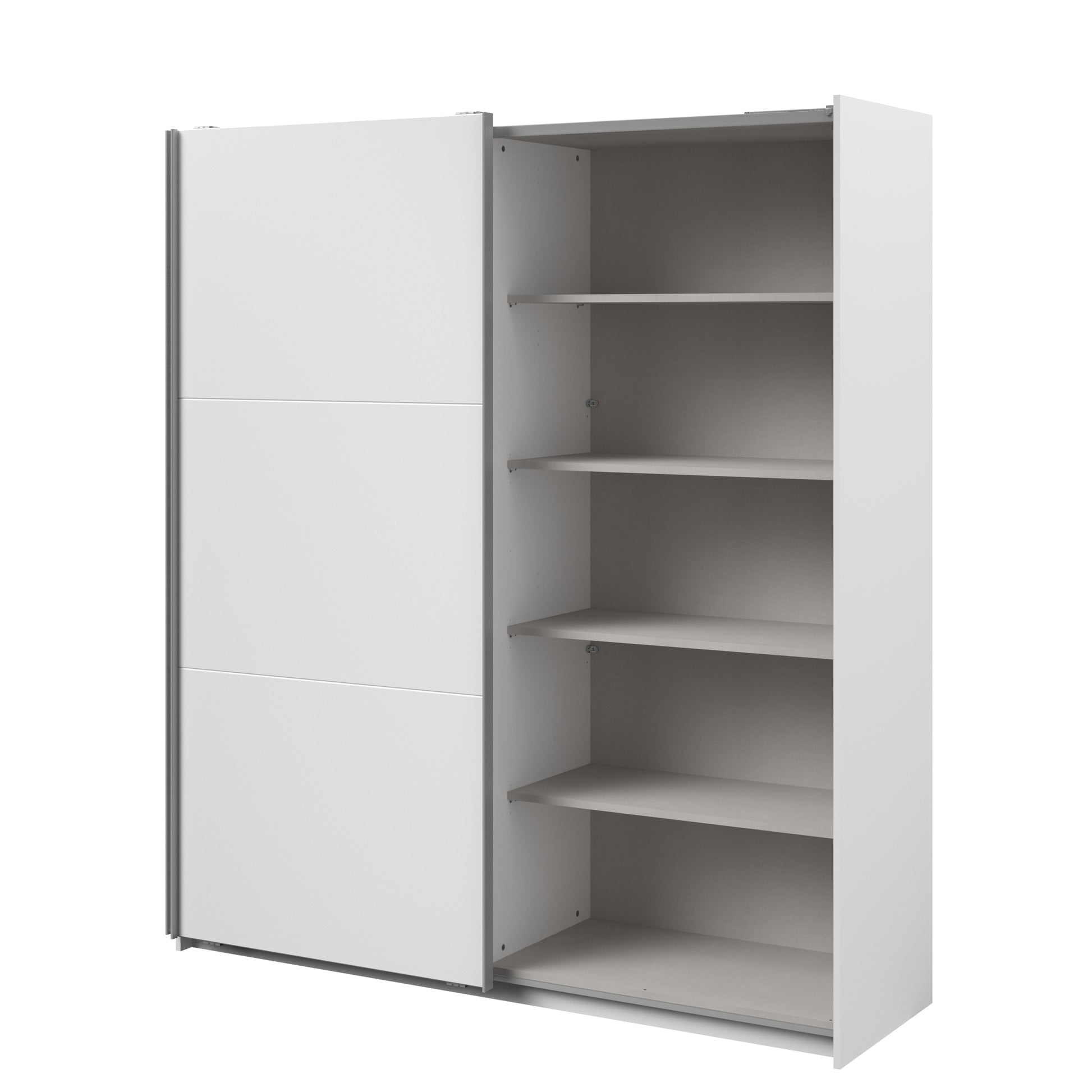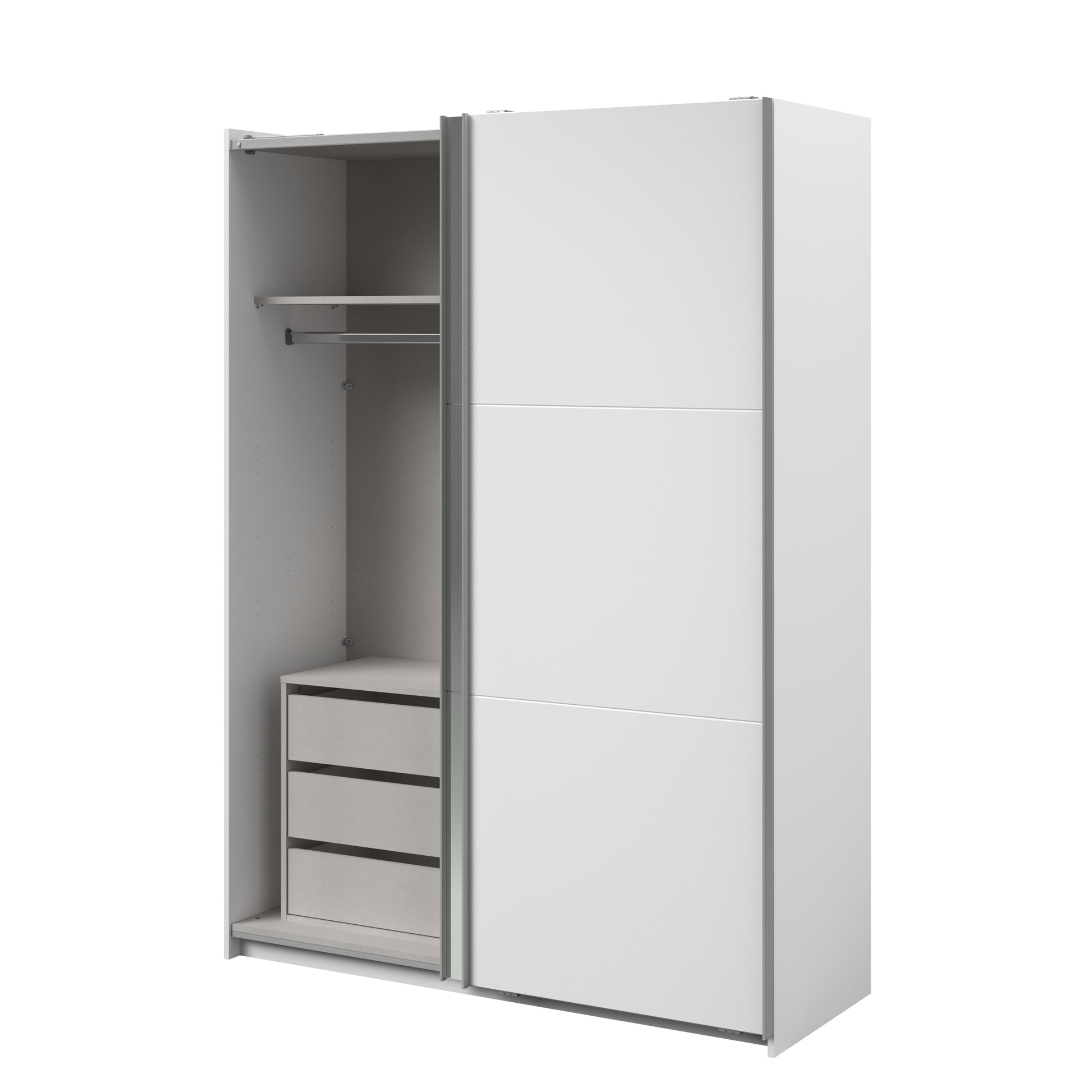 Parisot white mirrored finish wardrobe with sliding doors. One side is hanging the other is shelves and can be reversed. There are 6 options for internal layout. Easy roll soft close mechanism. Smooth action sliding doors. Can be assembled on delivery if required. In stock for fast free delivery every postcode in the UK within 2 weeks!