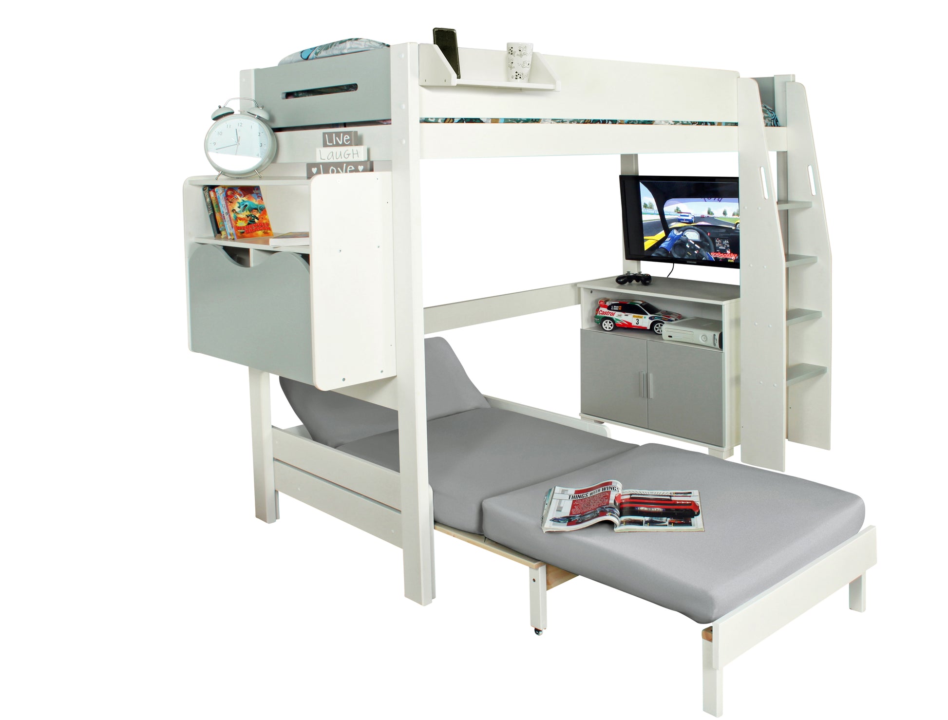 As well as a comfortable loft bed there is a chair bed with silver foam set, a combi chest featuring a cupboard with open shelf above and a brilliant Lap Tab desk that attaches to a gable end. The bed is constructed from a white painted solid pine frame with grey MDF gable ends and ladder treads.