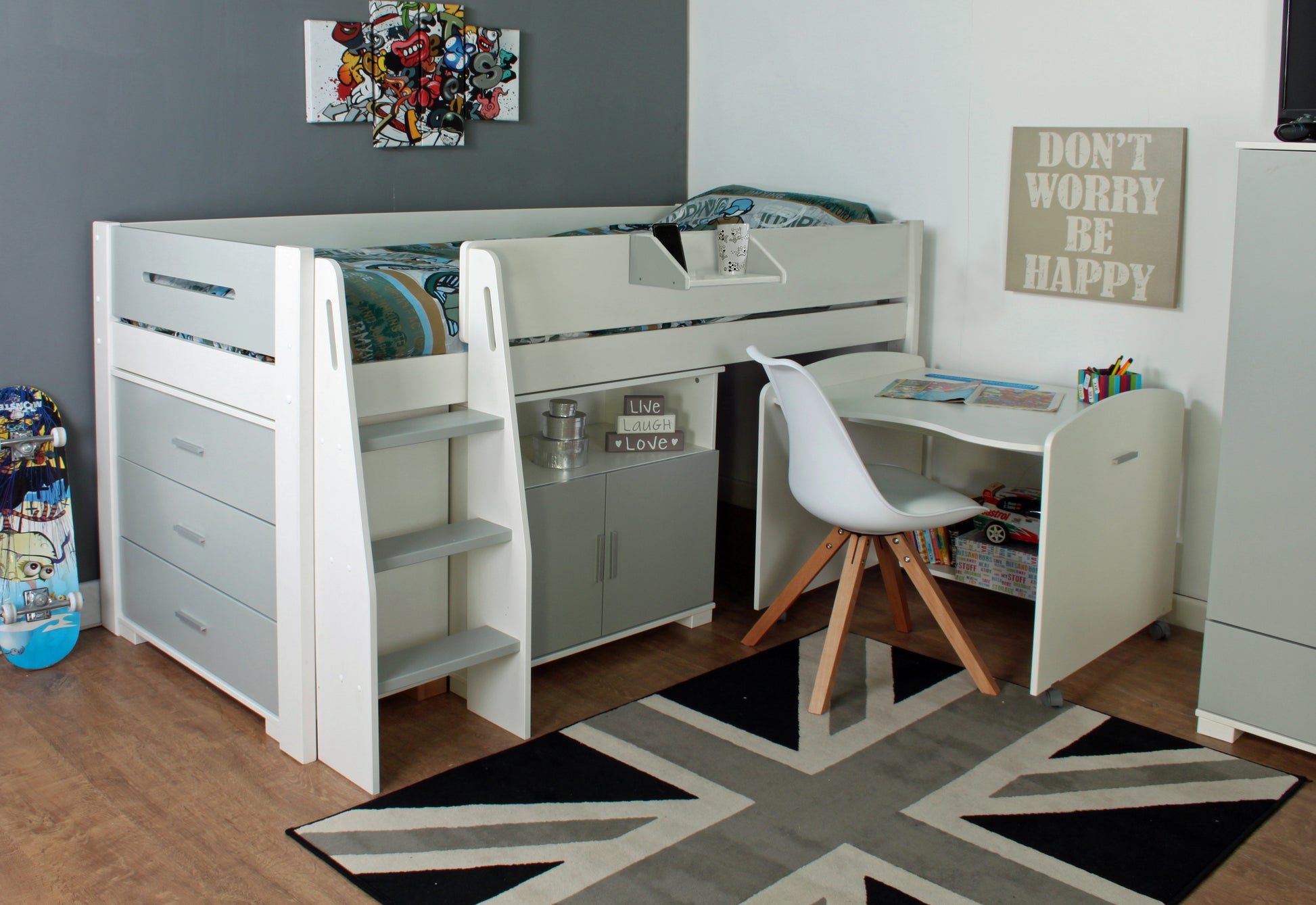 The Kids Avenue Urban 1 grey mid sleeper bed features a sturdy white frame with grey detailing, spacious 3 drawer chest, two door storage cupboard and pull out work desk. Suitable for use with a 90cm wide by 200cm long single mattress which offers additional growing space for your child over a standard UK sized mattress. The Kids Avenue Urban 1 grey mid sleeper bed step ladder can be fixed to the front left or right side of the bed frame to best suit your child's bedroom layout.